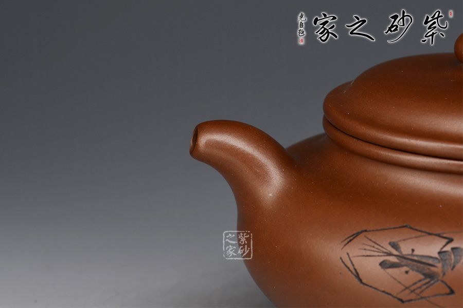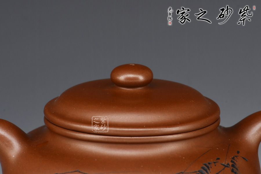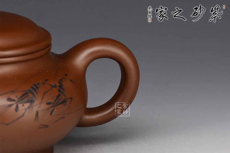 此壺為作者選用文革紫泥,全手工精制而成,泥色溫潤(rùn)雅致。造型仿“鼓”之形,壺身扁圓,壺腹飽滿,鈕、蓋、身三位一體,線條銜接流暢。流、把挺拔胥出,呈對(duì)稱之勢(shì)。整器工藝精良,氣韻充沛,出水爽利,容量380CC,是一把非常實(shí)用的殺茶利器。