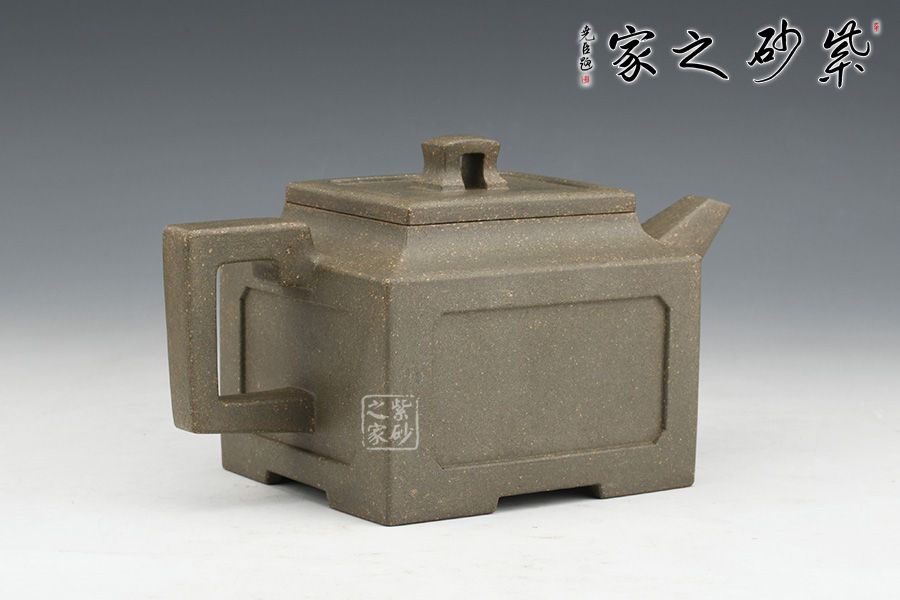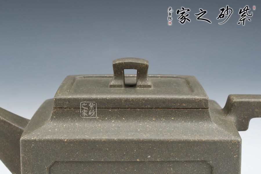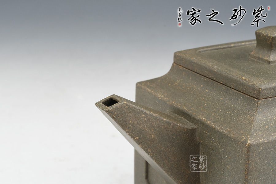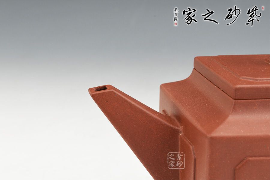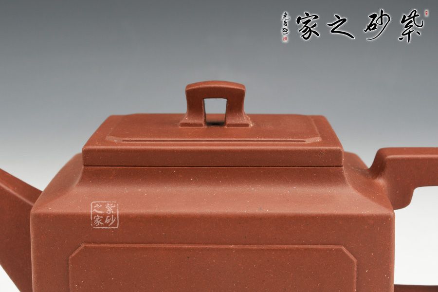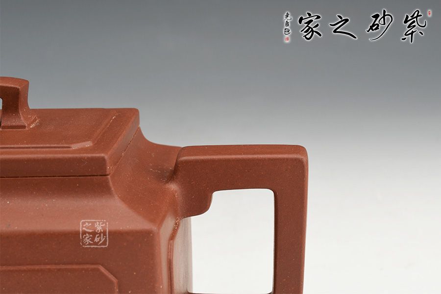 壺身、壺口、壺蓋、壺鈕均為正方形。側(cè)視,整個壺呈—“亞”字形。形制方正嚴(yán)謹(jǐn),渾樸厚實(shí),面大且寬,角鈍而韻,線挺而直,口蓋方而寓圓,底圈大而趁勢,流有直曲變化,把方而切體,鈕洞扁而大。
