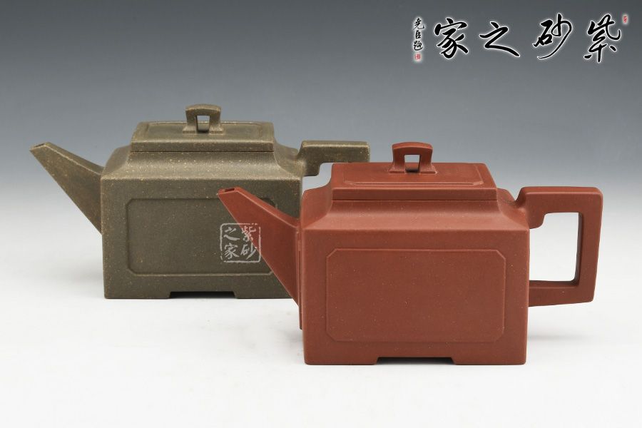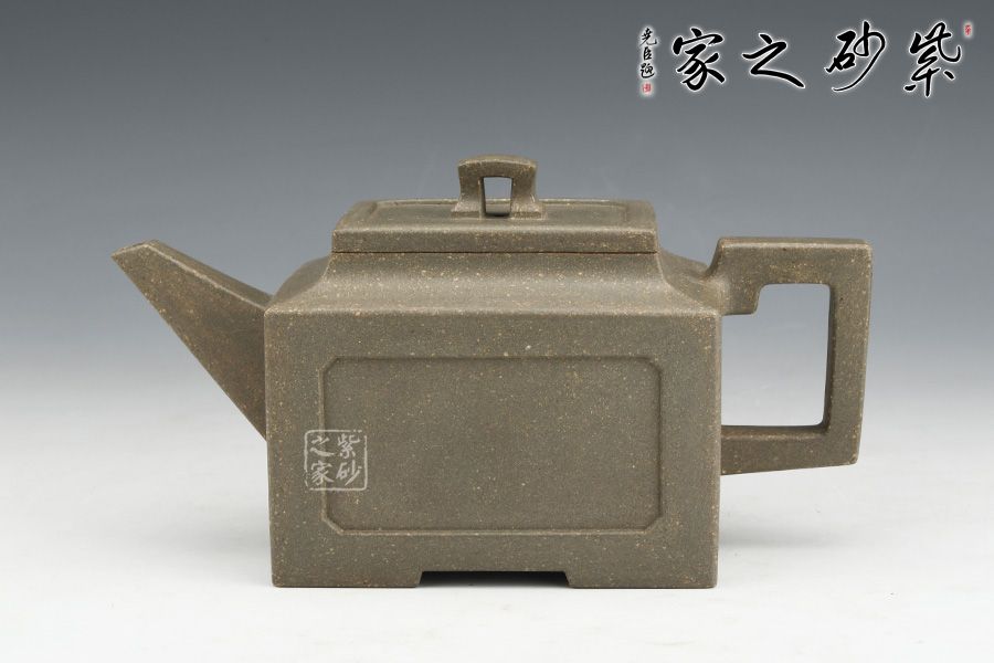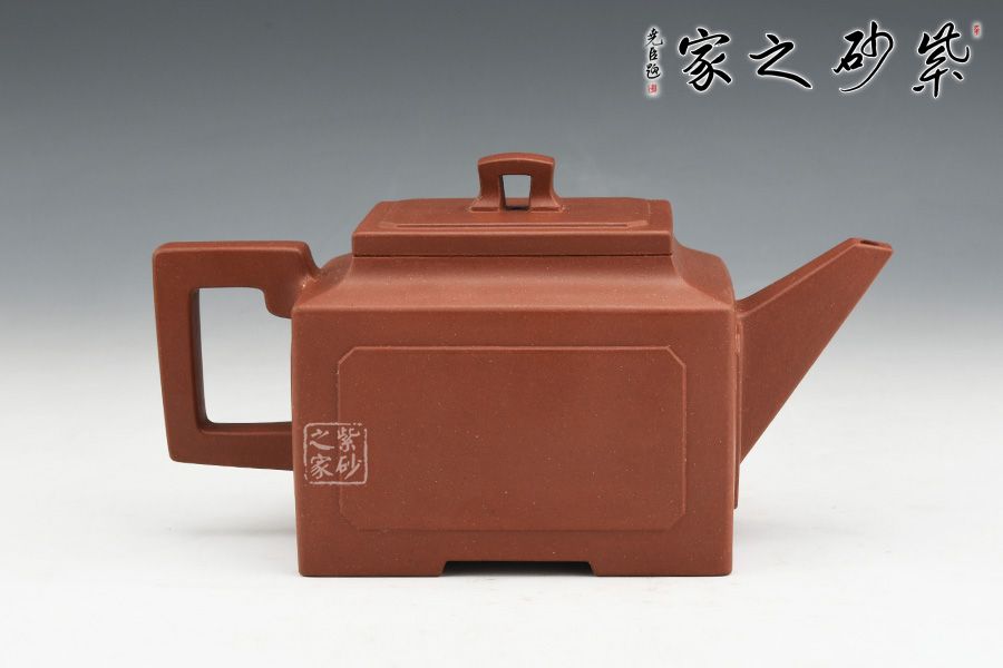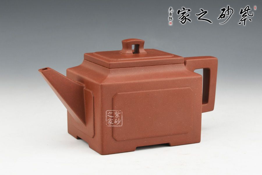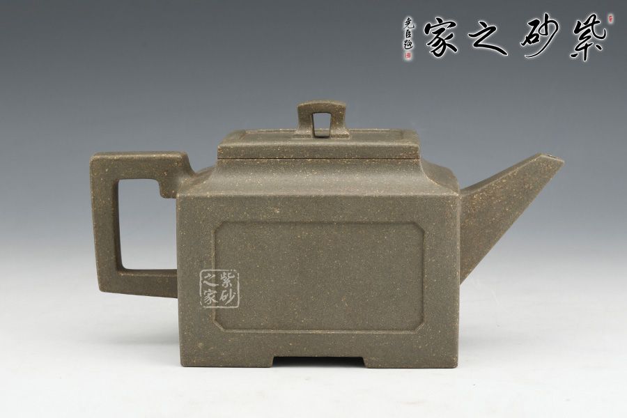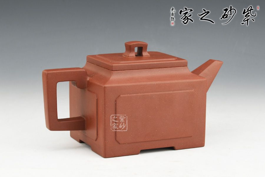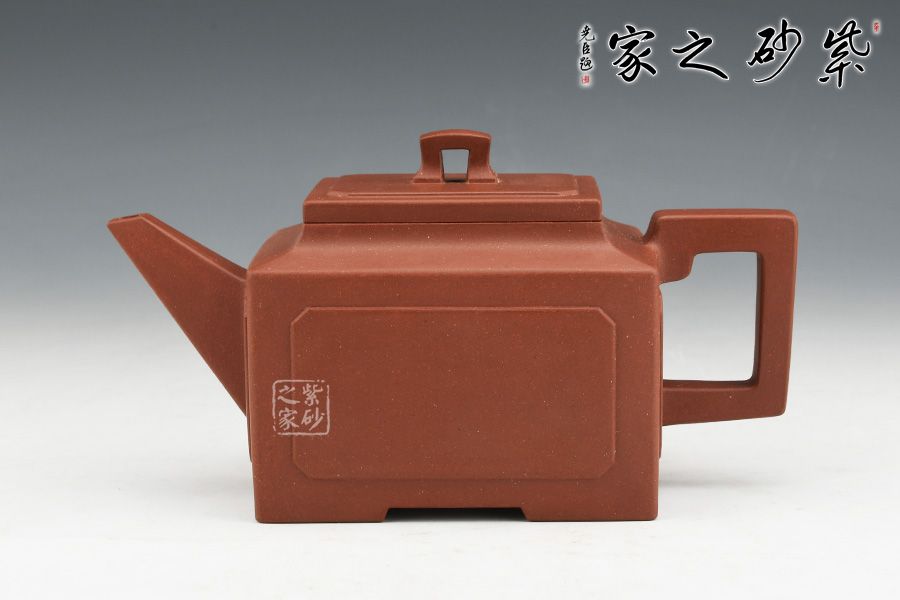 壺身、壺口、壺蓋、壺鈕均為正方形。側(cè)視,整個壺呈—“亞”字形。形制方正嚴(yán)謹(jǐn),渾樸厚實(shí),面大且寬,角鈍而韻,線挺而直,口蓋方而寓圓,底圈大而趁勢,流有直曲變化,把方而切體,鈕洞扁而大。
