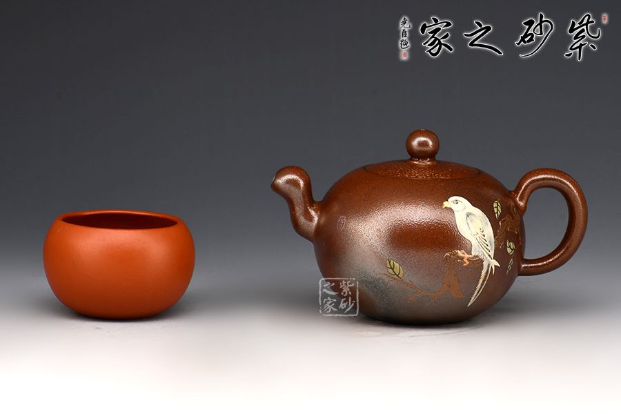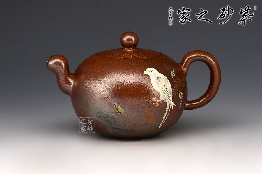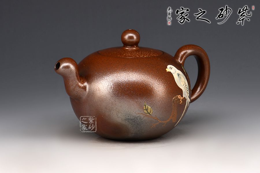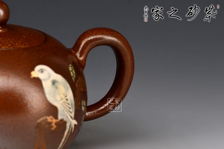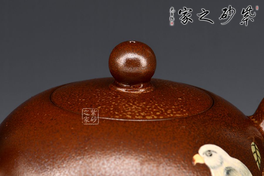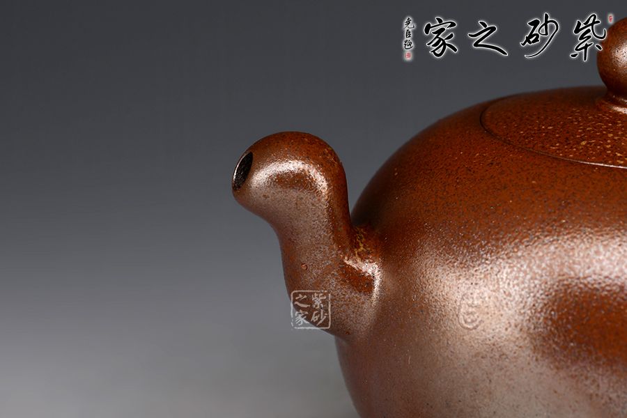 經(jīng)典壺型“一粒珠”,壺鈕與壺身均為圓潤飽滿的球形,晶潤溫婉;截蓋設(shè)計,嵌蓋與壺身融為一體,更顯示出壺身的圓潤,彎流婉轉(zhuǎn)胥出,渾厚飽滿,嘴頭明顯收縮,形成嬌憨可愛的氣韻;壺把與壺嘴相對應(yīng),把體比例均衡,拿捏有力。