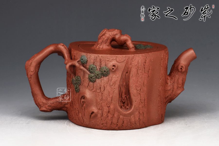 其造型古樸自然,壺身、流、把、蓋皆采用花塑器工藝精心制作成松樹枝節(jié)樣貌,肌理極其逼真,工藝之精絕美妙令人驚嘆。其不規(guī)則嵌蓋與壺口嚴(yán)絲合縫,壺鈕巧取松節(jié)一段,匍匐貼合于蓋首,其上松針刻畫細(xì)致入微、生動(dòng)形象。既有古樸典雅之神韻,又滿富老松蒼勁老辣之勃勃生機(jī)。
