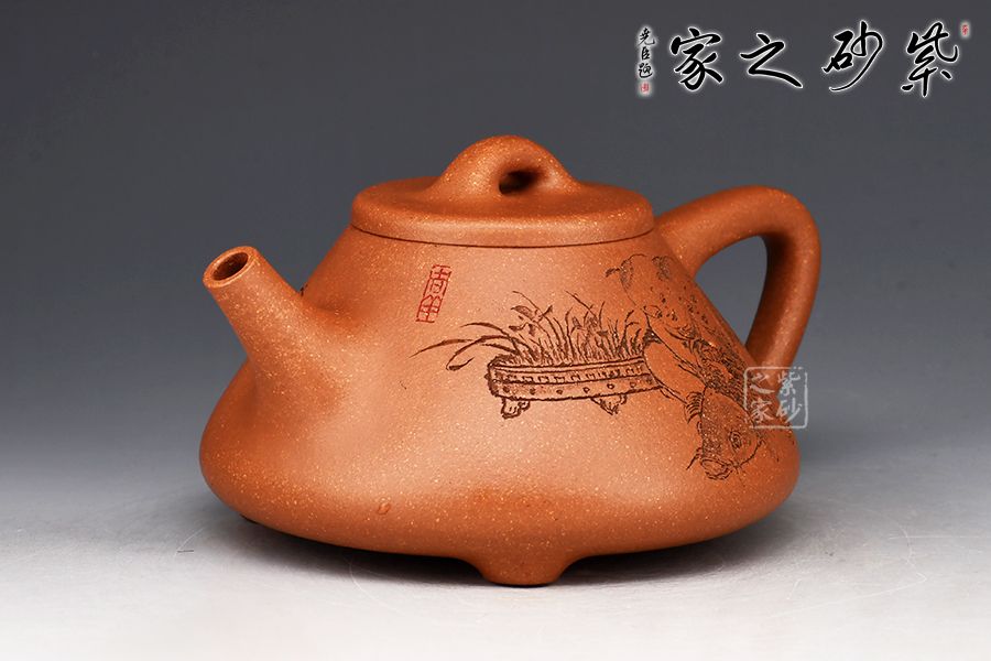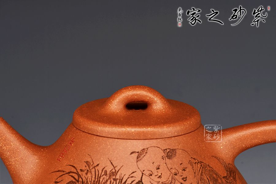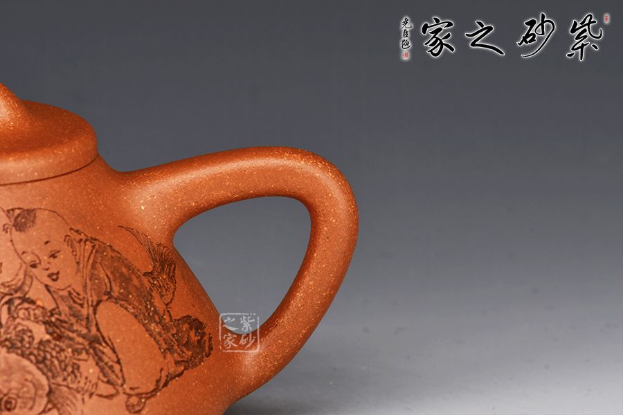 此壺為經(jīng)典的石瓢壺型,壺身呈三角形,形態(tài)雅致,舒展挺拔,端莊穩(wěn)重,柔中帶剛;該壺線條飽滿,壺底部與壺腹部乃是小弧面圍繞而成,連成較為圓滑的圓 錐體;壺嘴較為修長,直挺胥出,挺括有力,狀似喇叭,出水沖勁十足;明接三角形端把剛毅有力,尖端轉(zhuǎn)折圓潤,十分稱手;壺底三足圓潤精巧,穩(wěn)重鼎立;此壺的刻繪內(nèi)容則展現(xiàn)了此壺特有的內(nèi)涵和情趣。