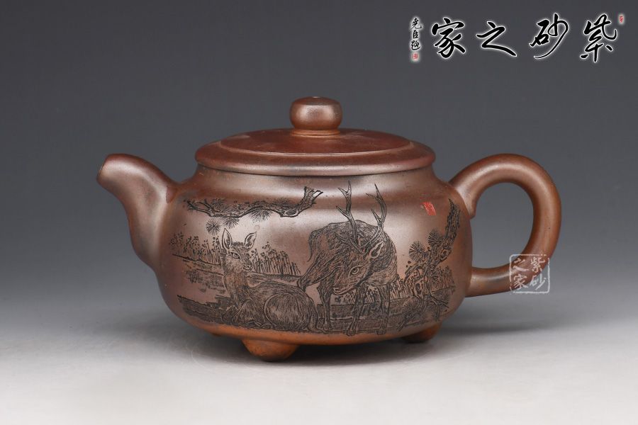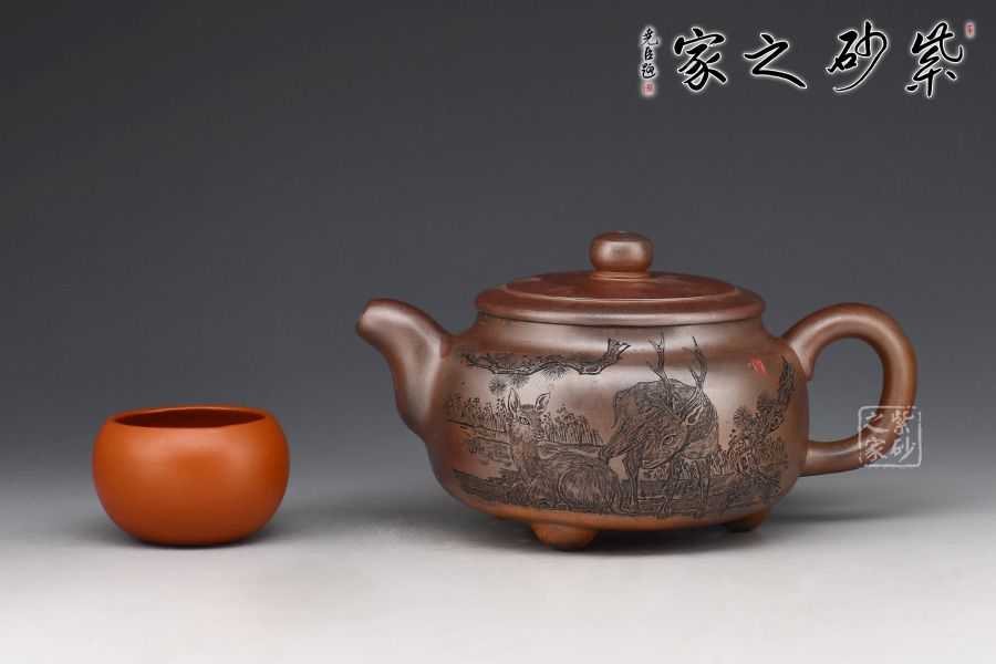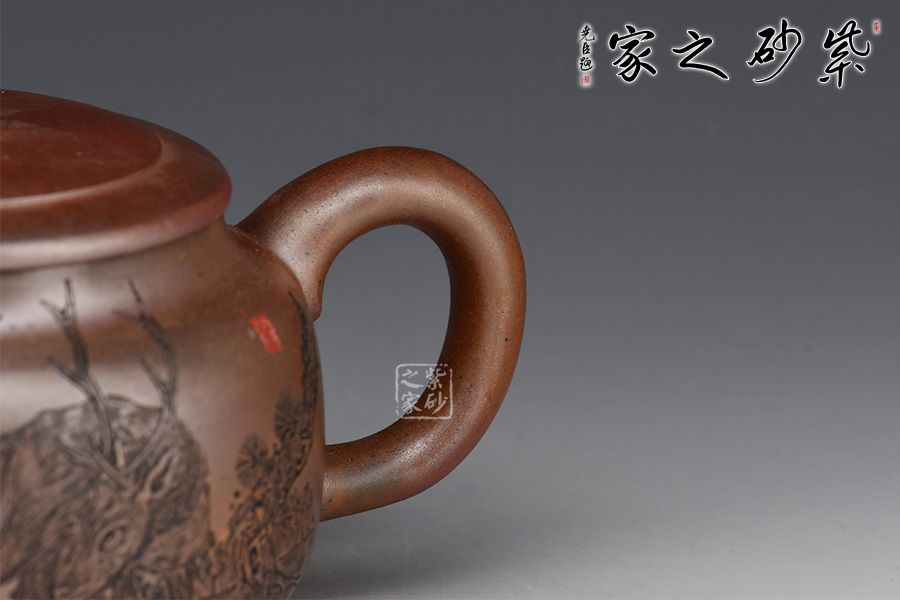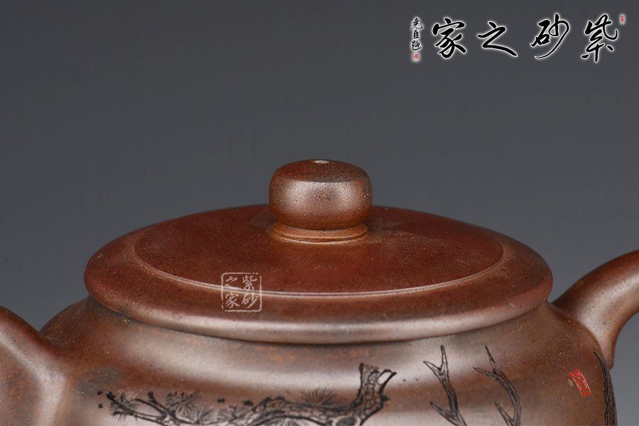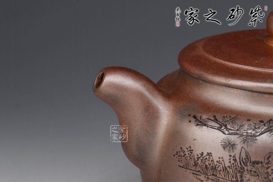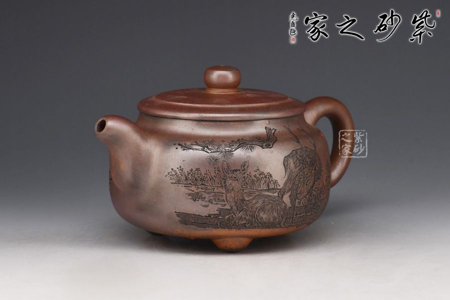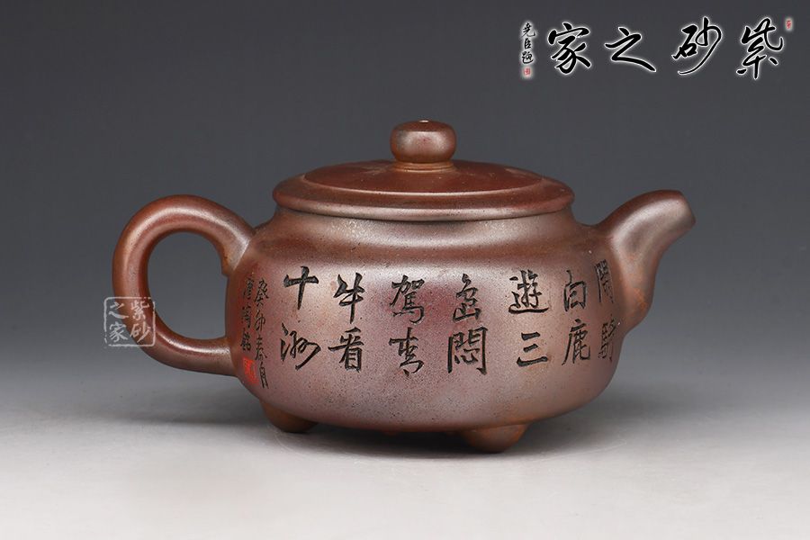 壺身呈柱形,端莊大氣,輪廓突出。平蓋嚴絲合縫,邊沿光滑細膩,柱形鈕形似縮小版的壺身,上下對照。二彎粗嘴,出水爽利,圈把粗細有致,圓潤大方。再加上三鼎足來拱衛(wèi),此壺更顯氣勢非凡。