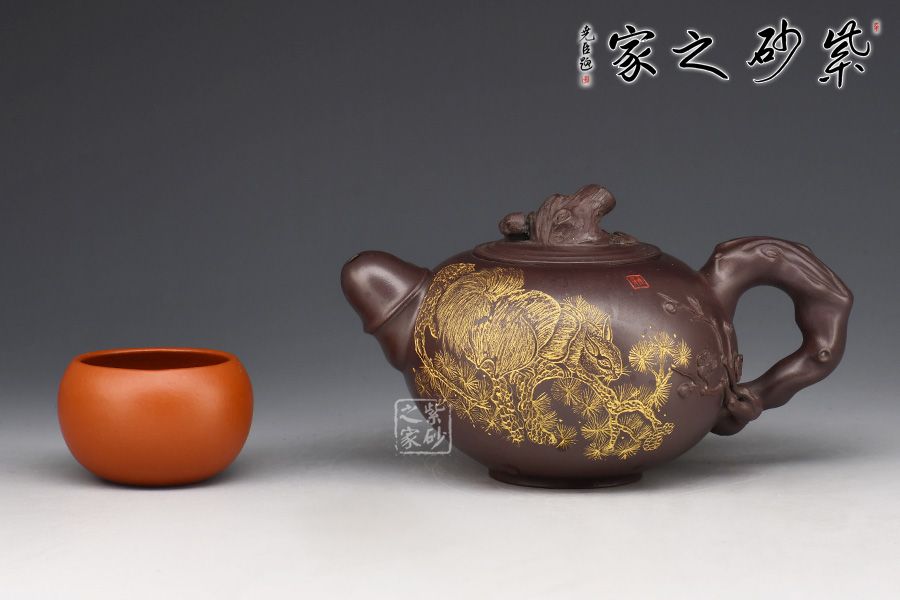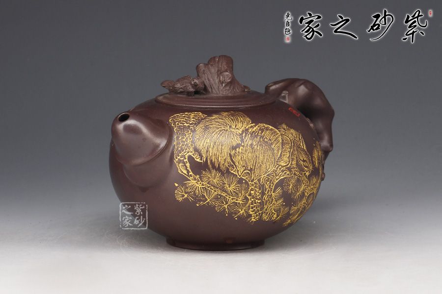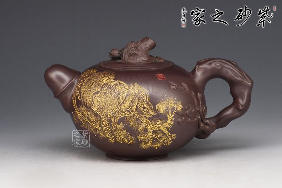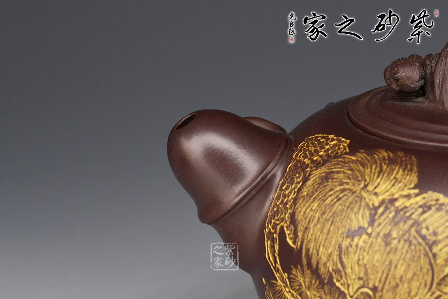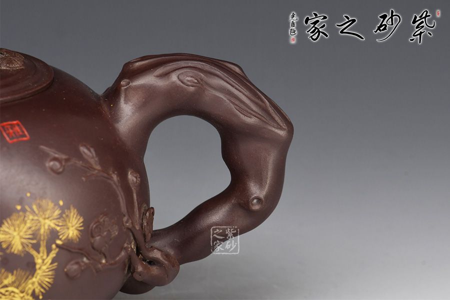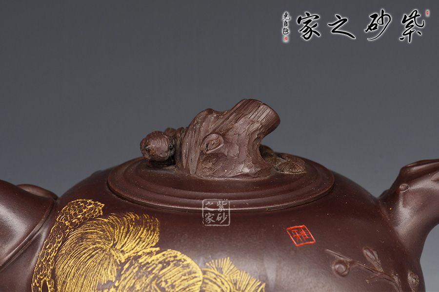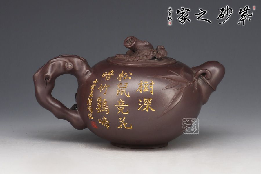 此款“松竹梅”壺身飽滿,配以美感十足的花貨造型,整器散發(fā)著吉祥、大氣的韻味;壺身圓潤,嵌蓋設計,氣密性良好,壺鈕為松樹樁,竹節(jié)為耳形壺把,從旁胥出竹葉,竹子的俊逸挺拔表露無遺,梅花為彎流壺嘴,從壺嘴處延伸出的梅枝梅花,傲然挺立,清幽飄香,有一種舒心的隨意之感。壺身刻繪松鼠,靈動乖巧,神韻十足。