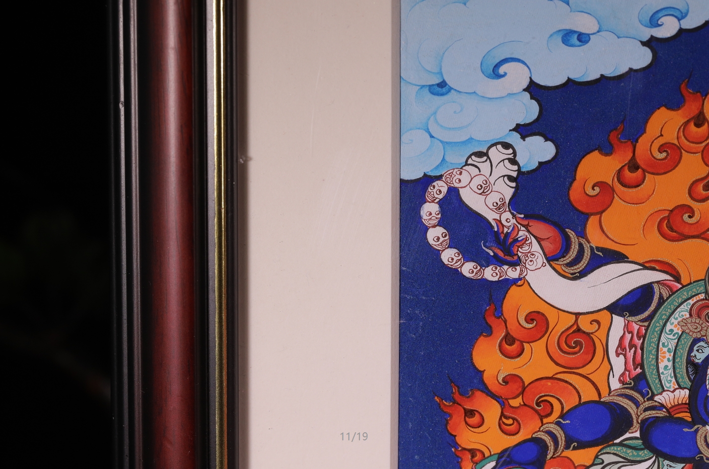 | 唐卡“師傅”開臉,筆路穩(wěn)重流暢。體現(xiàn)完美天人相,可見佛菩薩慈眉善目,賦予唐卡畫像生的靈氣。 | 細(xì)節(jié)決定品質(zhì),點睛之筆不到位影響整體美觀,五官比例不協(xié)調(diào),面目呆板,缺乏靈氣。 |