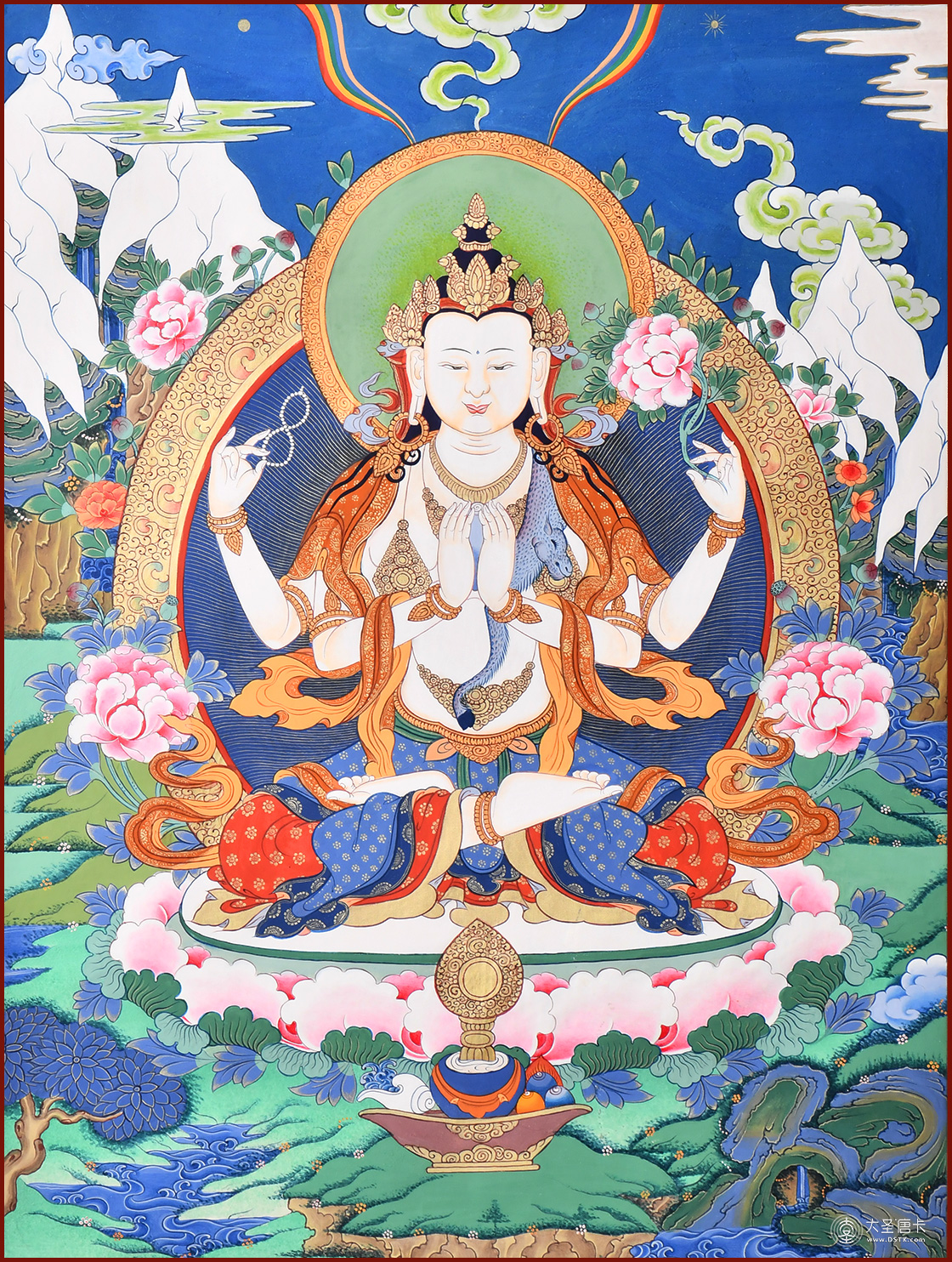 四臂觀音,雪域西藏的守護(hù)神,為西藏佛教密宗本尊之一。本尊身顏潔白如月,頭戴五佛冠,發(fā)黑色結(jié)髻,中央二手合掌於胸前,捧有摩尼寶珠,右手持水晶念珠。左手拈八瓣蓮花與耳際齊,面貌寂靜含笑。