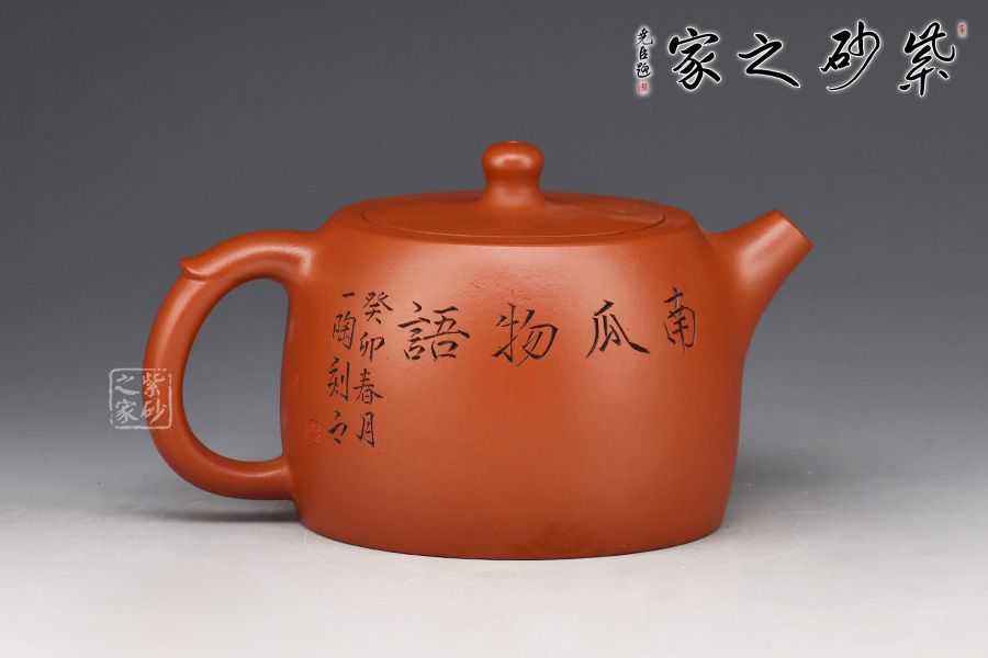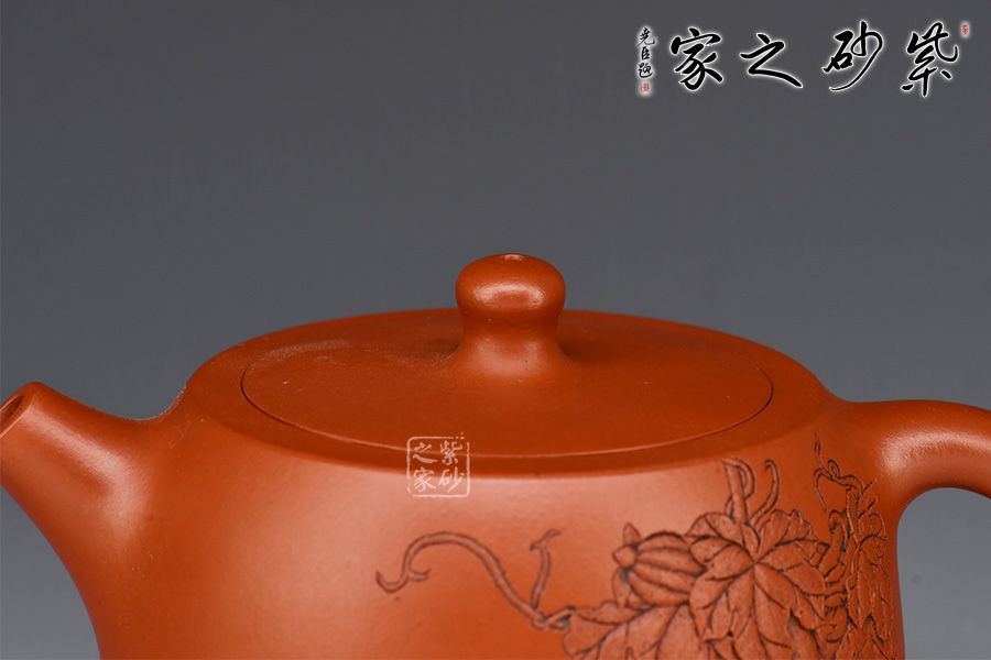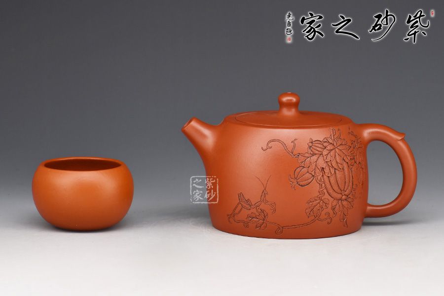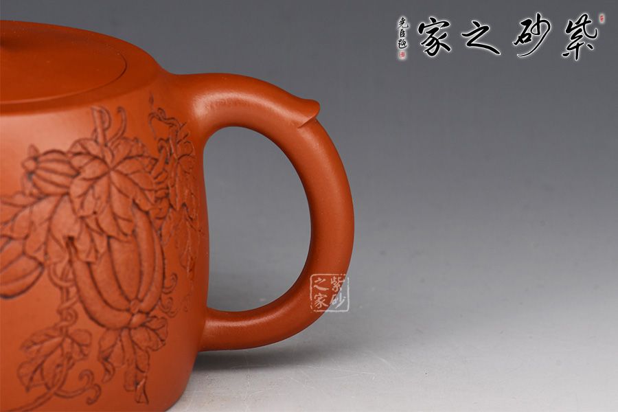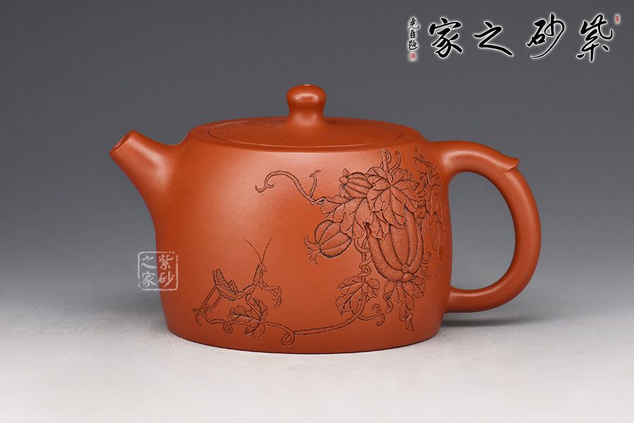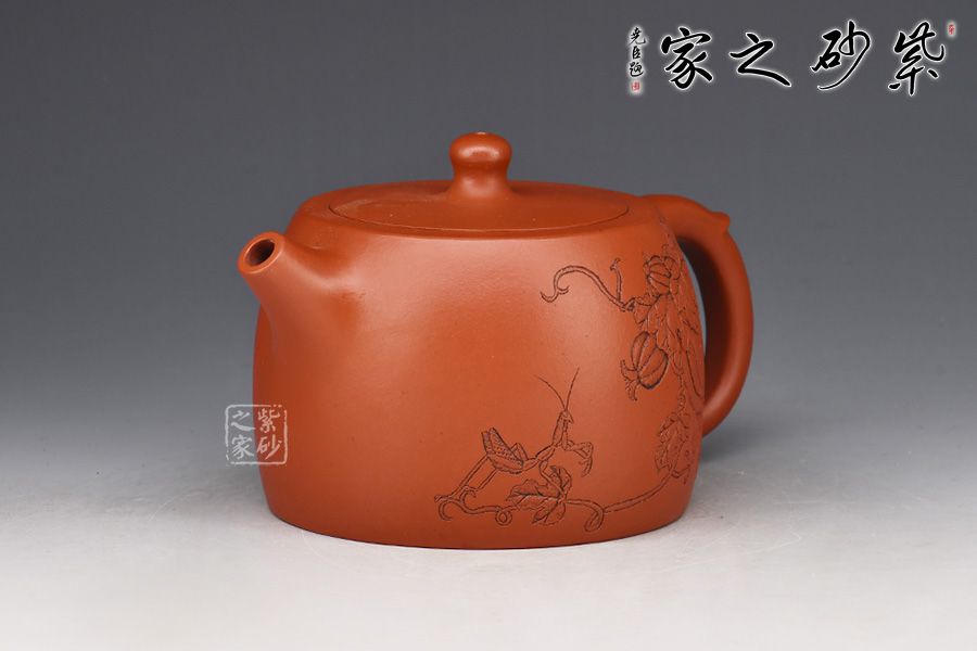 老師紫砂深浮雕陶刻一絕,正面刻繪南瓜藤蔓,枝葉交錯,藤蔓相纏其用筆蒼老勁健,螳螂栩栩如生,反面刻繪“南瓜物語”四個大字。