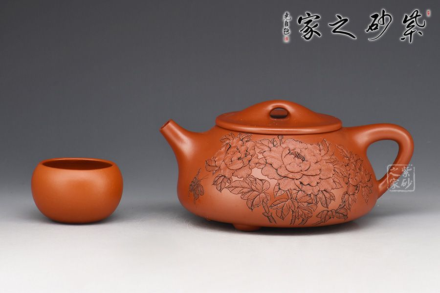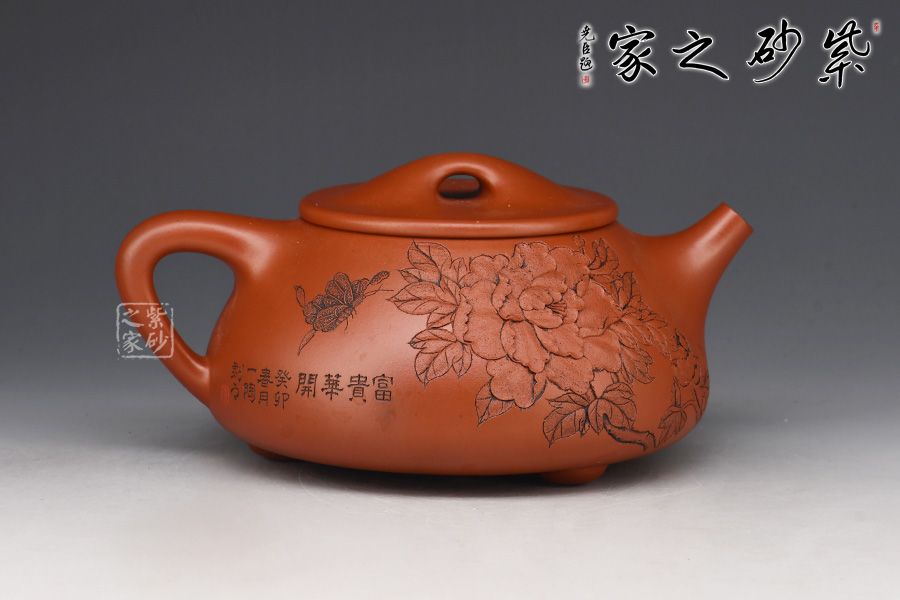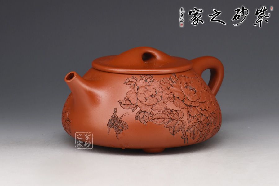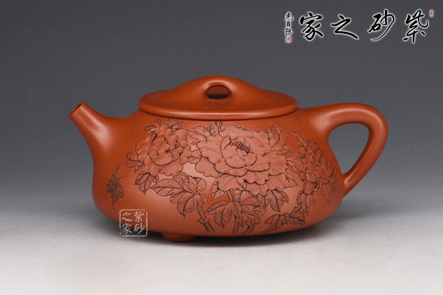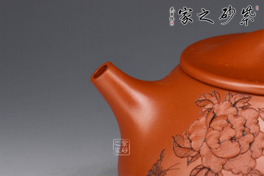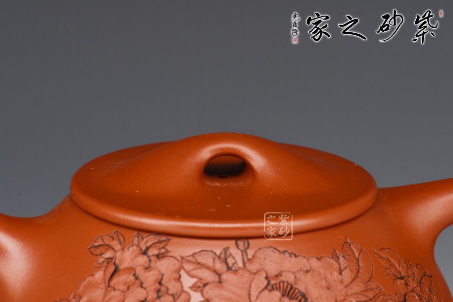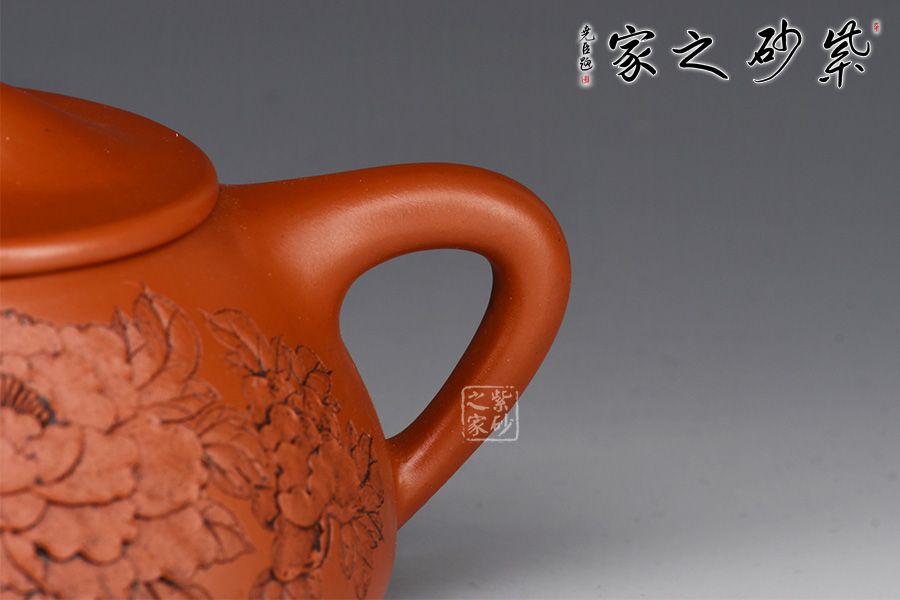 此壺為作者摹古而作,以景舟石瓢為型,全手工精制而成。壺身呈八字造型,豐潤(rùn)飽滿,曲線柔和流暢,平壓蓋、橋鈕,拿取自如,直流簡(jiǎn)而有力,出水順暢,壺把上豐下斂,與壺身之型形成和諧的美學(xué)效果,底部三乳足給人以輕靈而穩(wěn)重之感。老師紫砂深浮雕陶刻一絕,雙面刻繪盛世牡丹花,美不勝收。整器比例精湛,骨肉亭勻,氣韻充沛,是一把非常實(shí)用的品茶利器。