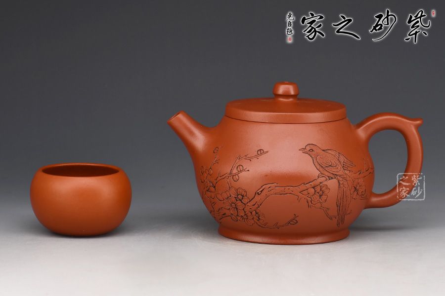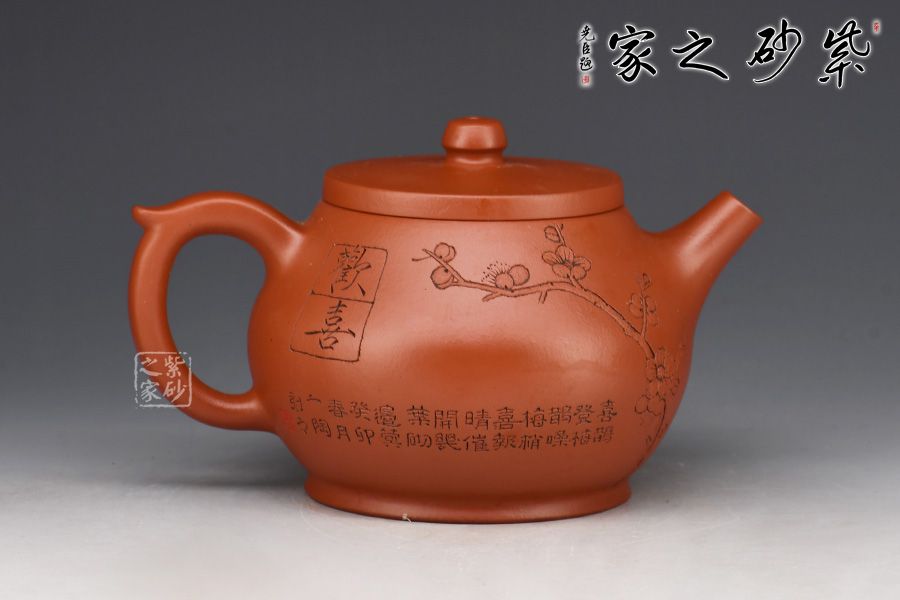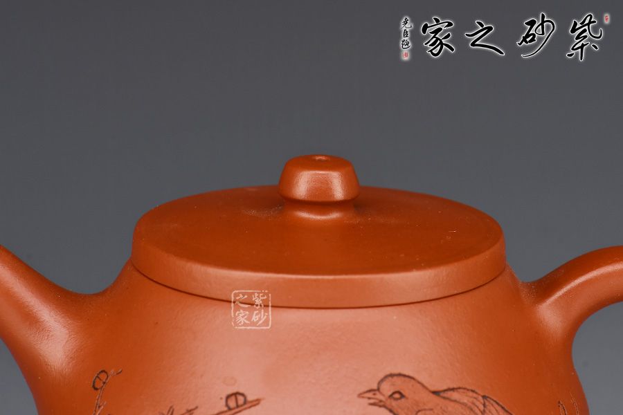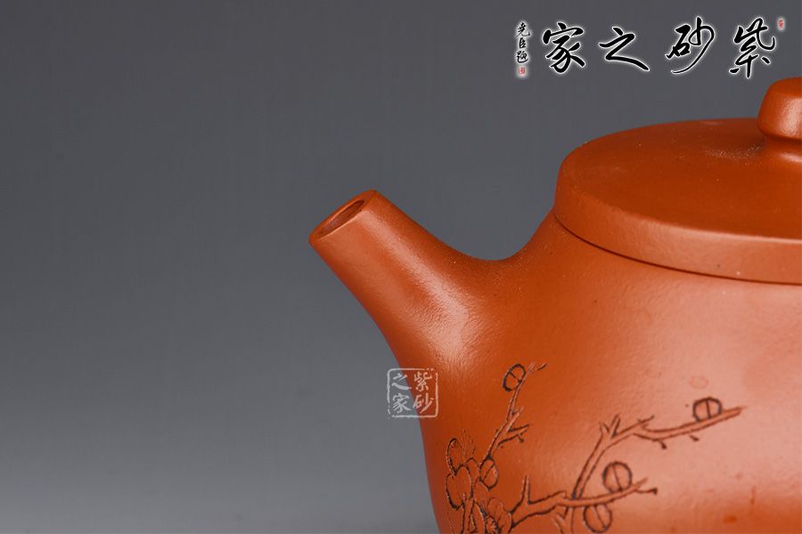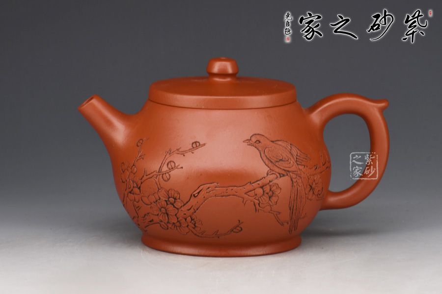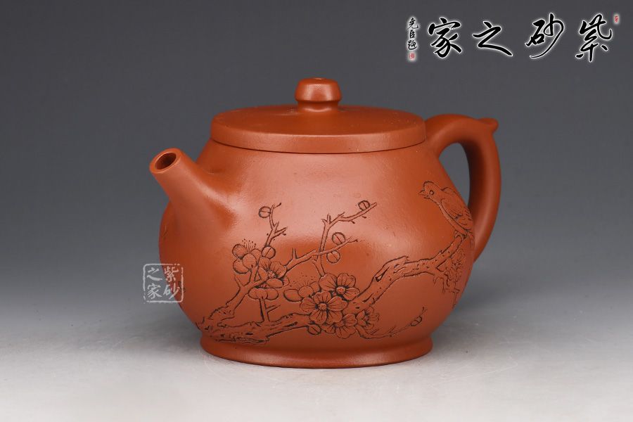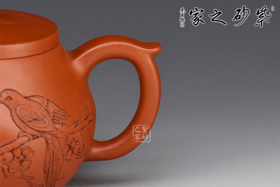 壺身線條流暢,壺腹飽滿。壺嘴昂首而立,飛把造型獨(dú)特,拿捏舒適。大口壓蓋,嚴(yán)絲合縫,柱形鈕形似縮小版的壺身,小巧精制。壺身刻繪喜鵲登梅圖,寓意好運(yùn)不斷!