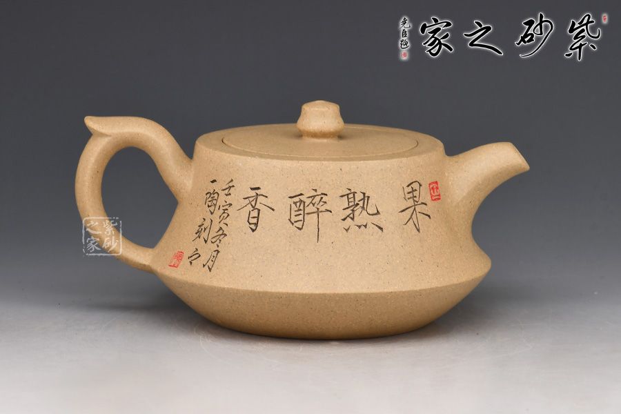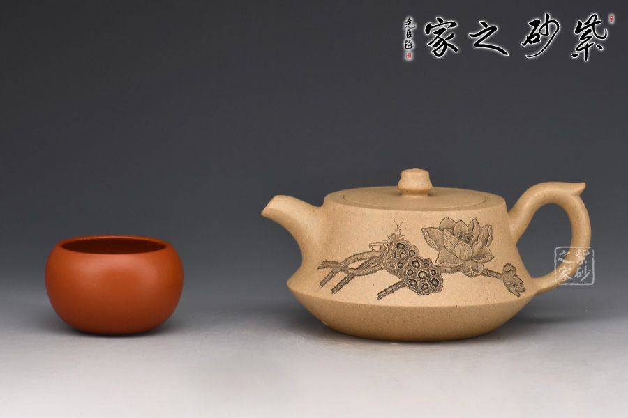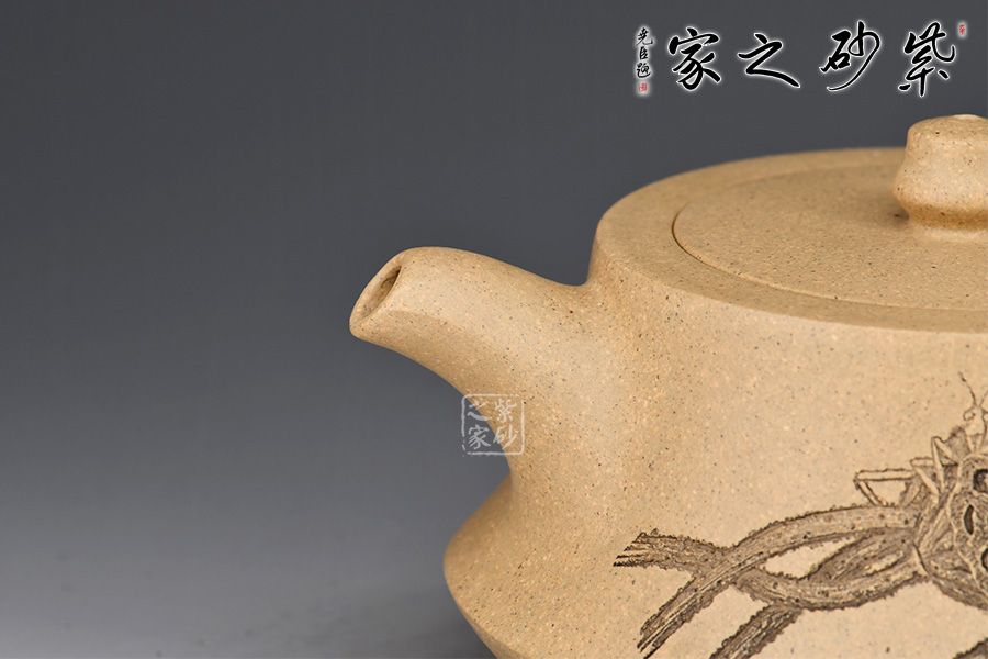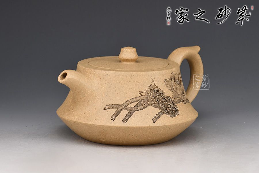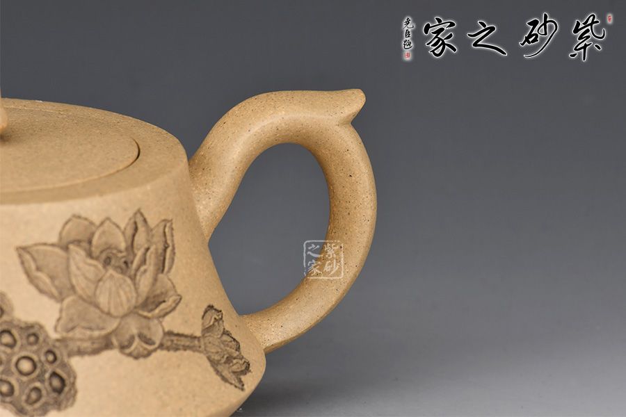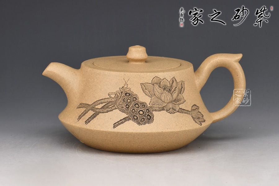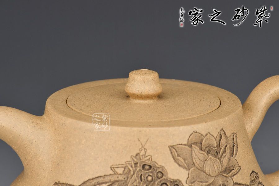 壺身中部微斂,上下皆豐,造型美觀。壺鈕若縮小版的壺身,精致可愛。嵌蓋設計,與壺身混若一體,天衣無縫,氣密性良好。耳形飛把,端握舒適稱手,且和方形壺嘴相互應和。壺身正面刻繪蓮花、蓮藕,壺反面刻繪了“果熟醉香”,荷葉落,蓮藕熟,初秋時節(jié),藕塘飄香。