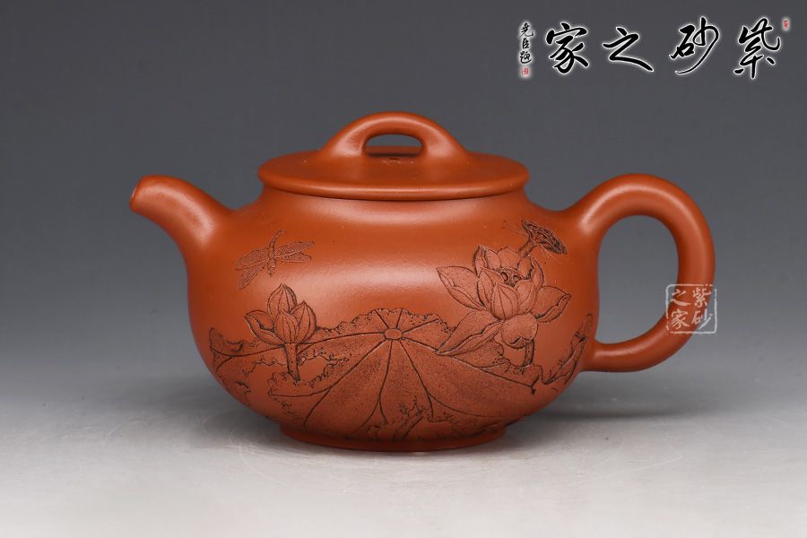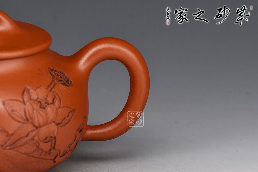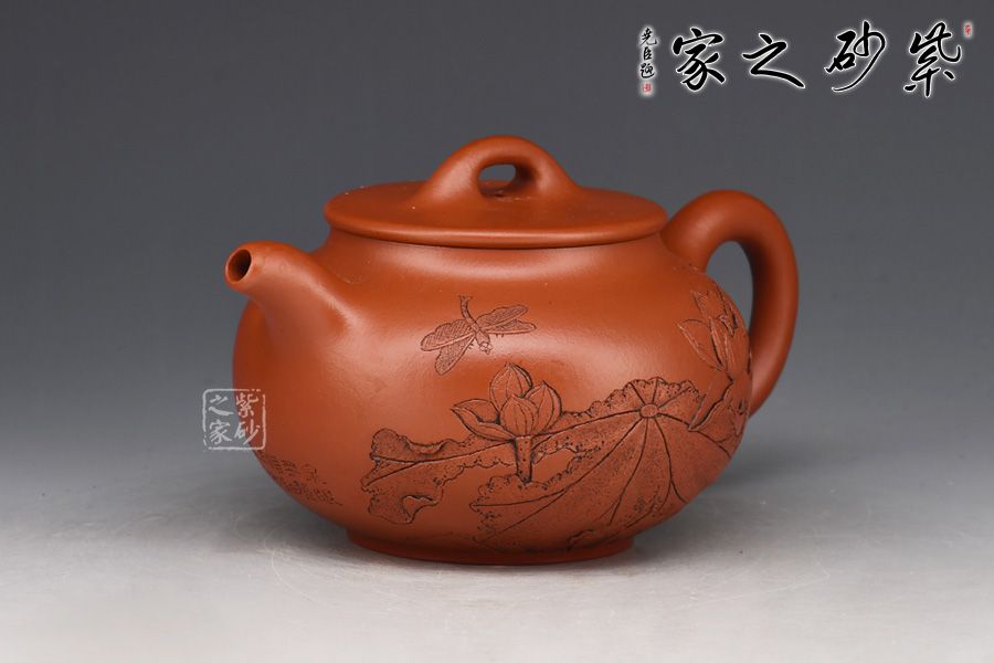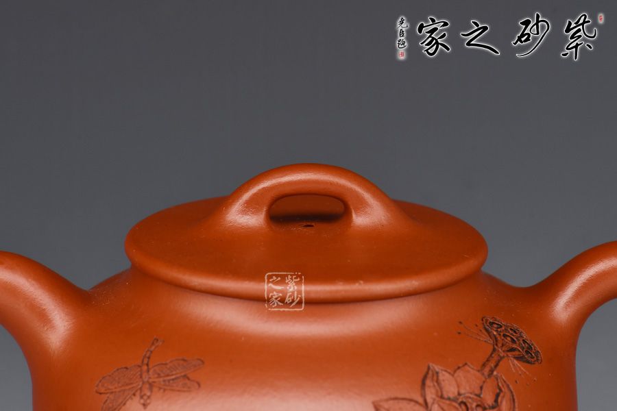 老師紫砂深浮雕陶刻一絕,正面刻池塘一角,雨打荷葉,脈脈荷花,蜻蜓立上,荷花與蜻蜓共舞,美極了。反面刻“品茗”二字,意境極佳,賞用藏皆可。