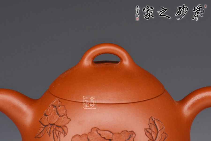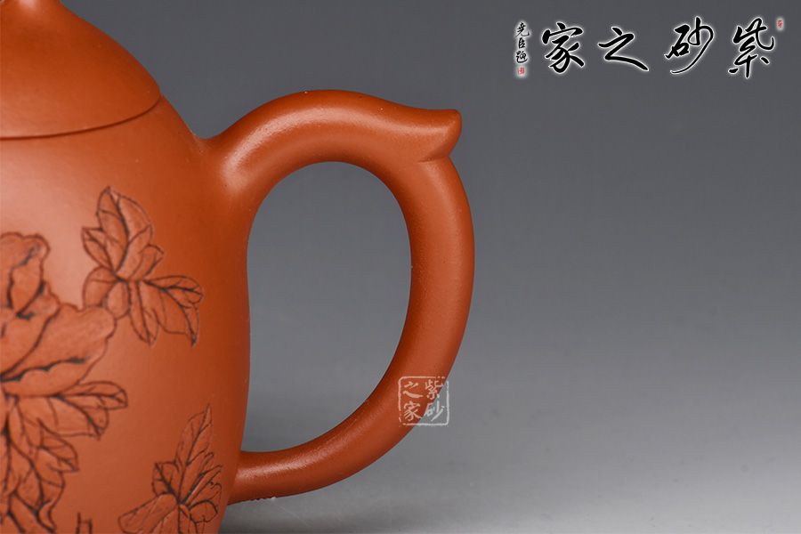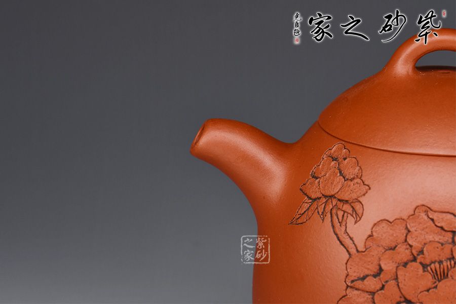 老師紫砂深浮雕陶刻一絕,正面刻繪牡丹花,雍容華貴,反面刻繪“花影舞動(dòng)”四個(gè)大字。整壺文人氣息濃厚,賞藏兼?zhèn)洹?/p>
