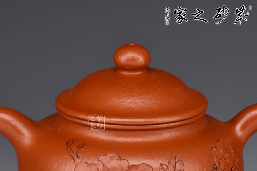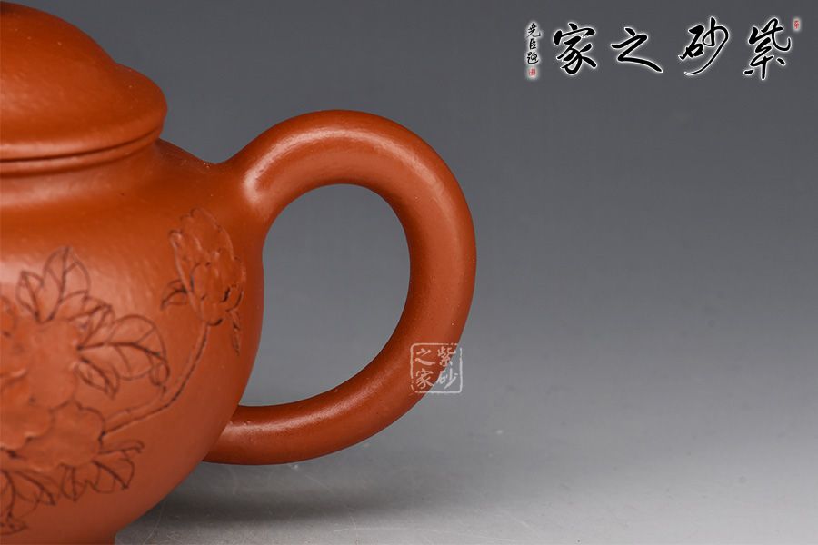 此壺為作者選用原礦紅泥,全手工精制而成,泥色溫潤,透氣性佳。壺身圓融飽滿,口蓋寬大,利于投茶。壺蓋隆起,壺鈕呈扁球狀,壺鈕、壺蓋、壺身以扁圓形相呼應(yīng),圓圓相疊,極富韻律。流、把自然胥出,線條柔和而圓潤,細(xì)膩而流暢,加之圈足,平添輕盈之感。