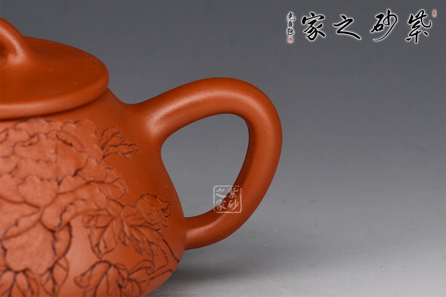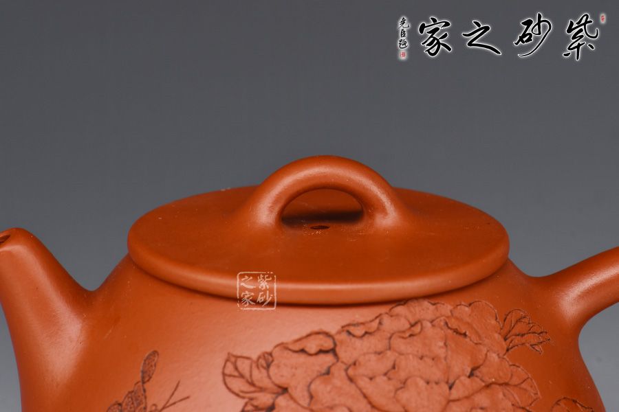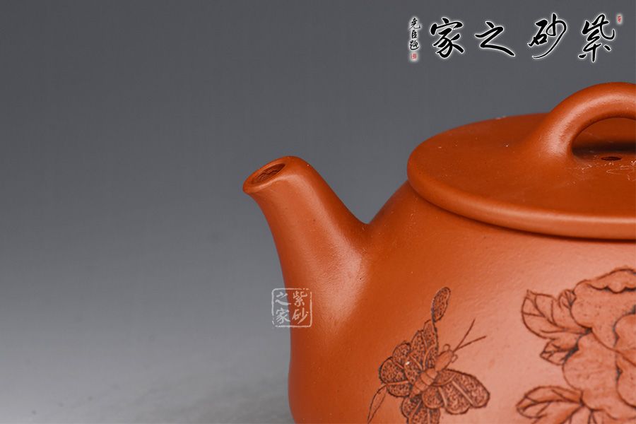 老師紫砂深浮雕陶刻一絕,正面刻牡丹圖,牡丹花艷麗多姿,美冠絕倫,蝴蝶翩翩飛舞,整幅畫面生動(dòng)活潑,栩栩如生。反面刻“國色”二字,前后畫與詞相呼應(yīng),賞藏兼?zhèn)洹?/p>