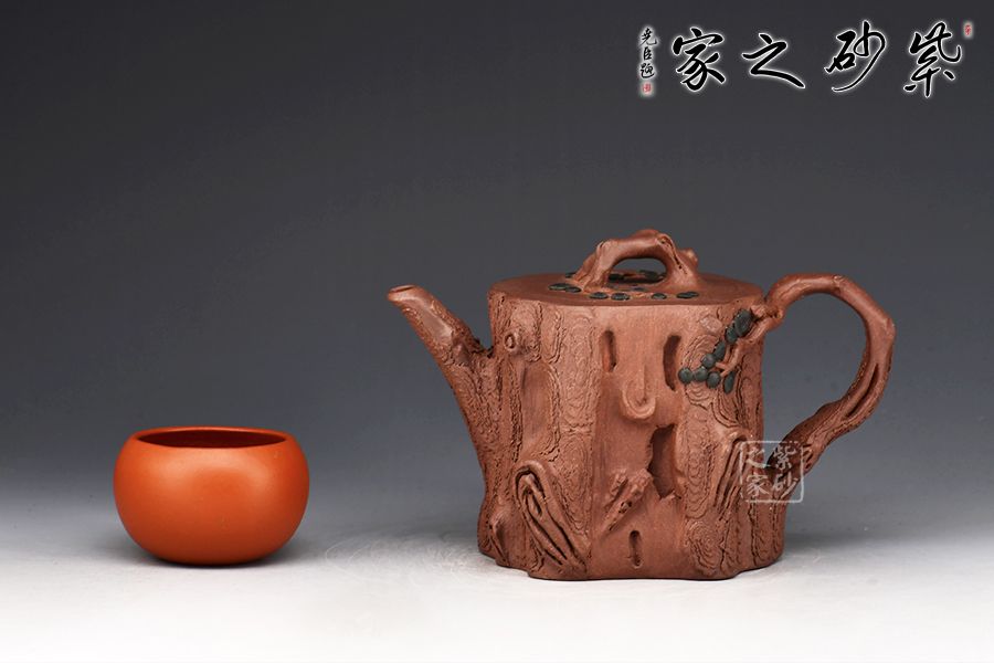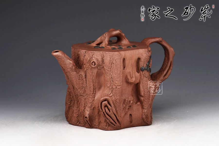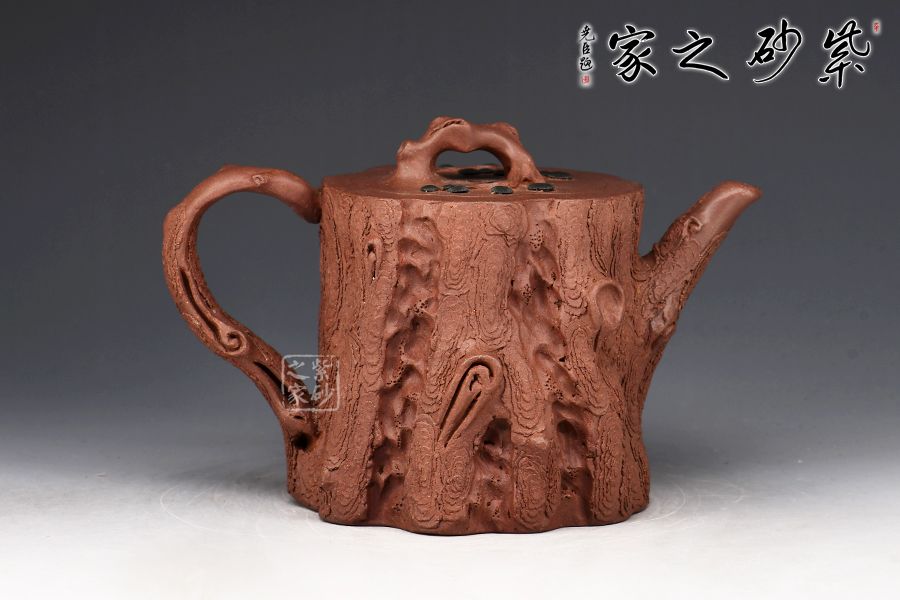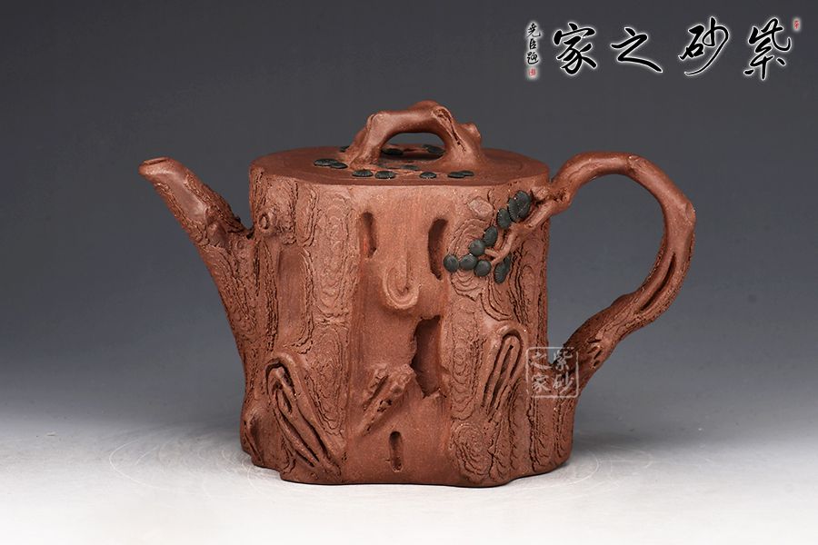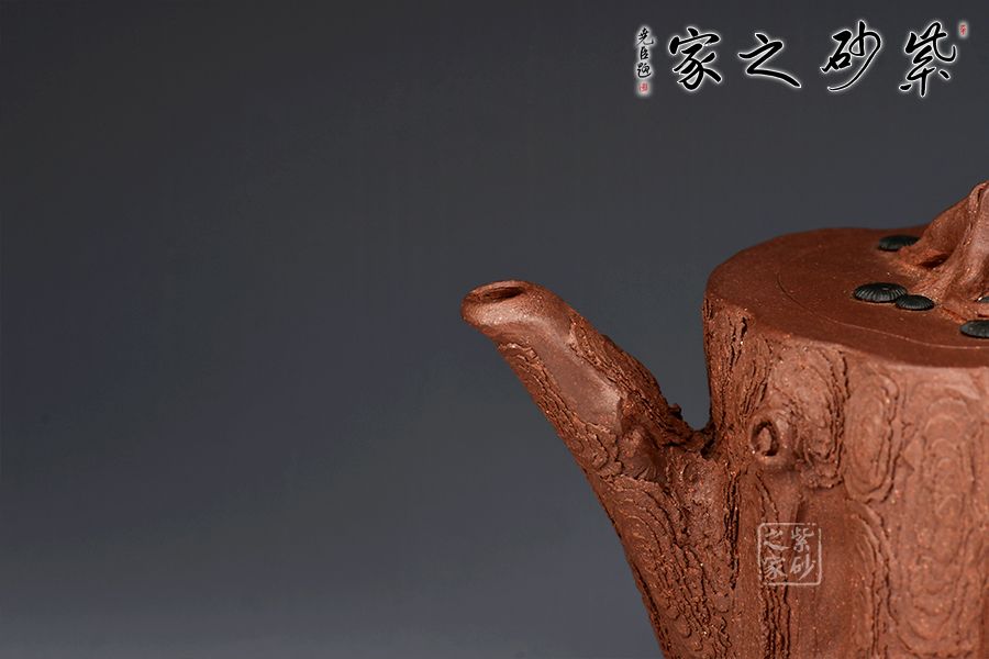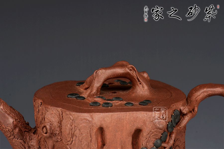 整件松段壺泥塑工藝精美,層層迭迭,將古松蒼老之外皮塑造的分外相似,生動而形象。整件作品用工精致,不僅是一把殺茶利器,更是一件精美的藝術品!