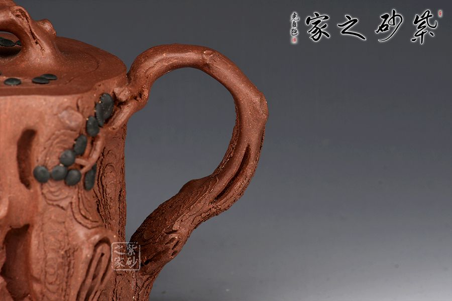 此壺精選原礦紫泥制成,色澤端莊厚重,質感豐盈,造型古樸,壺身,流,把,鈕皆做松樹枝節(jié),嵌蓋與壺把處松針青綠,極其逼真。