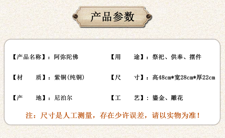 產(chǎn)地:尼泊爾 工藝:紫銅 創(chuàng)作年份:2020 題材:阿彌陀佛 繪制時(shí)間:0日 尺寸:22*28*48cm 重量:0 g 材質(zhì):紫銅 使用場(chǎng)地: