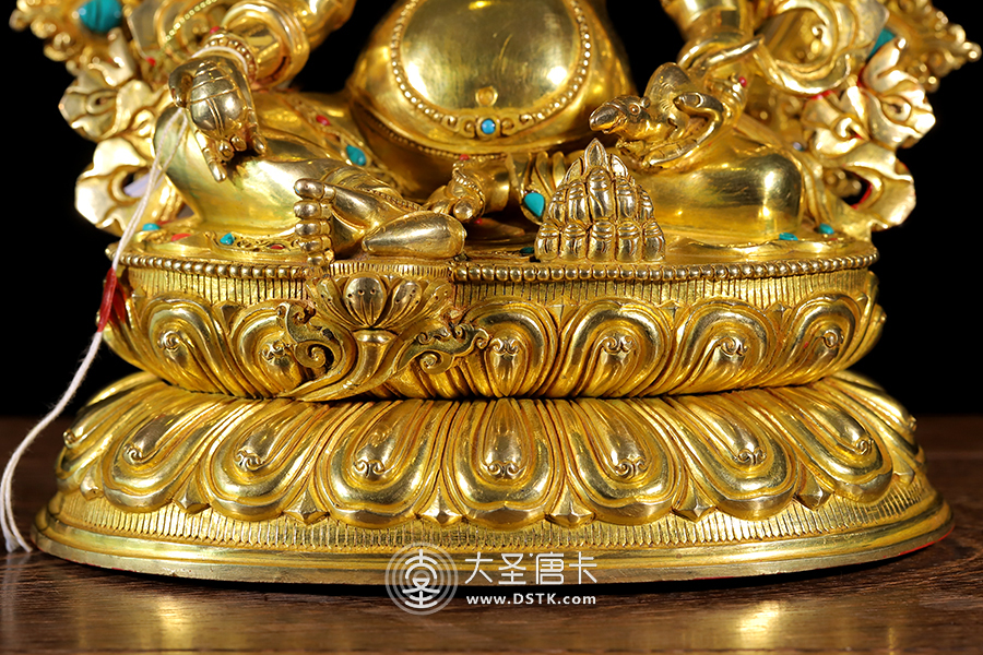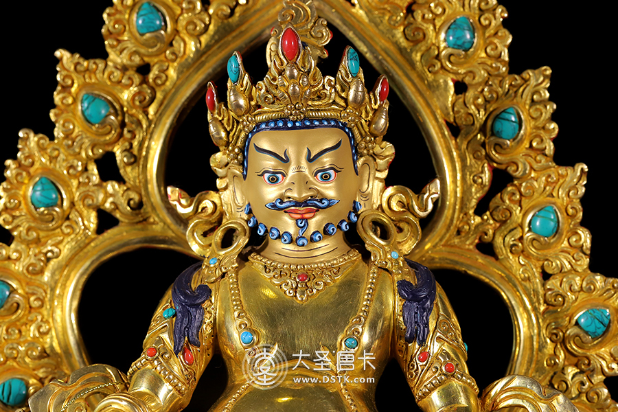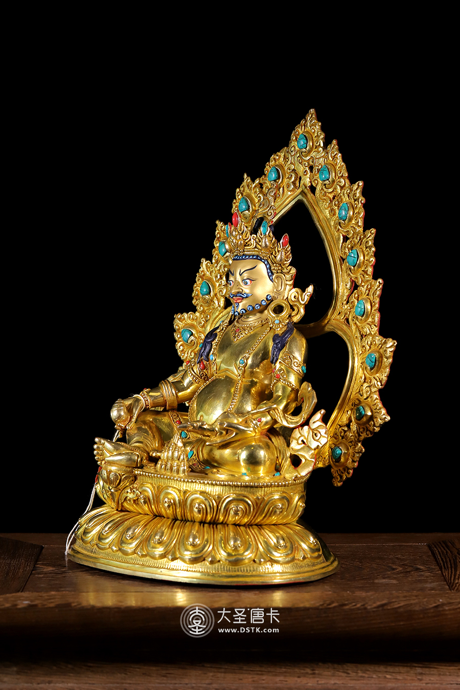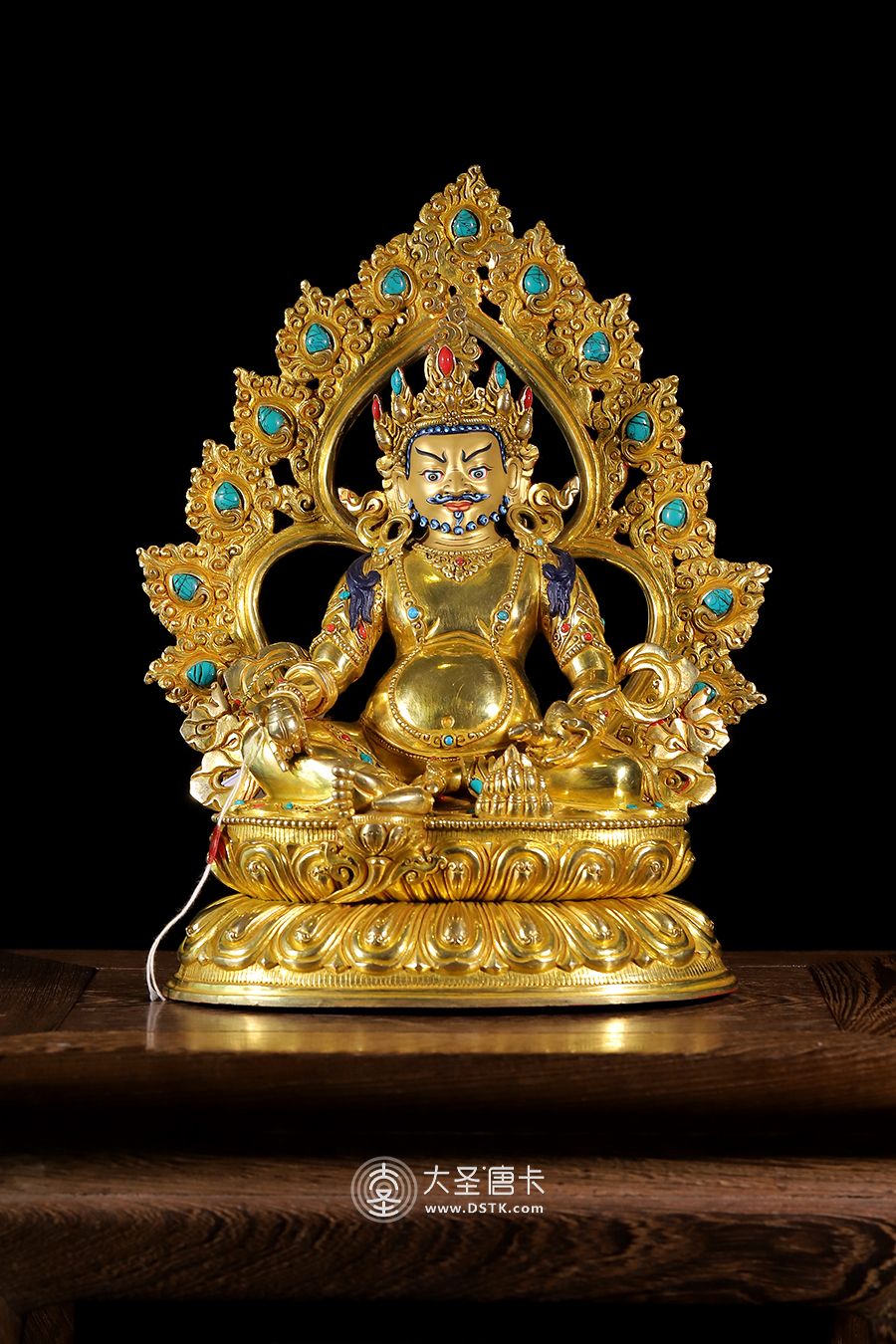 黃財神的形象為上身袒露,下身著裙,右手持摩尼寶,象征寶光普照十方,增添眾生的福報;左手抱一只大貓鼬(吐寶鼠),鼬的嘴里含著珠寶,象征財寶。右腳踏一只白色海螺,象征著他能入海取寶。