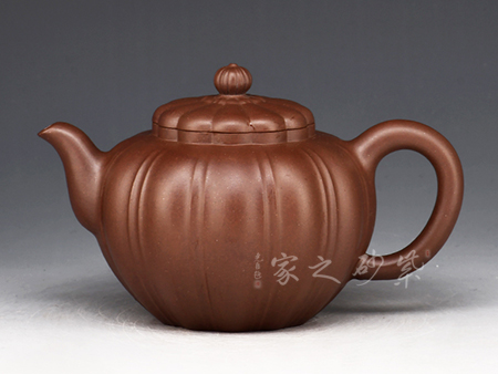 壺取南瓜形,而化合自然。嵌蓋與身合融,宛若天成;壺鈕為彎曲的瓜蒂,拿捏得當;直嘴出水爽利,耳把拿捏舒適。南瓜多籽、且藤蔓連綿不絕,寓意福運綿長。