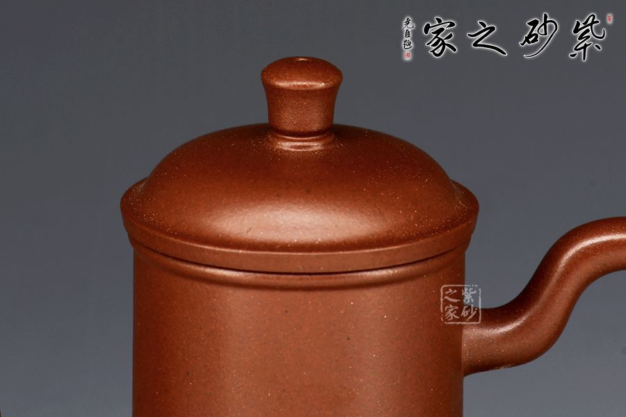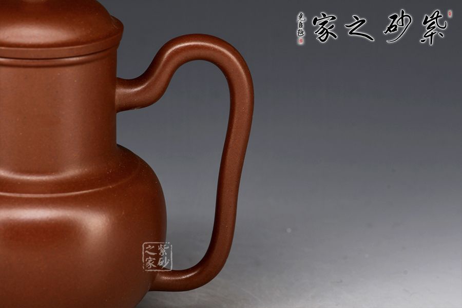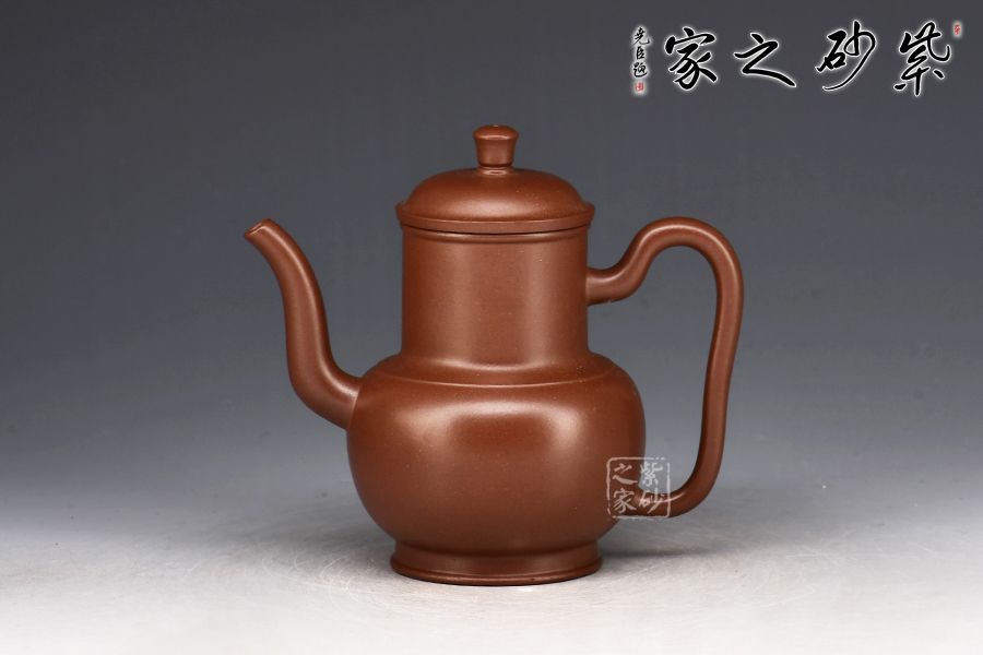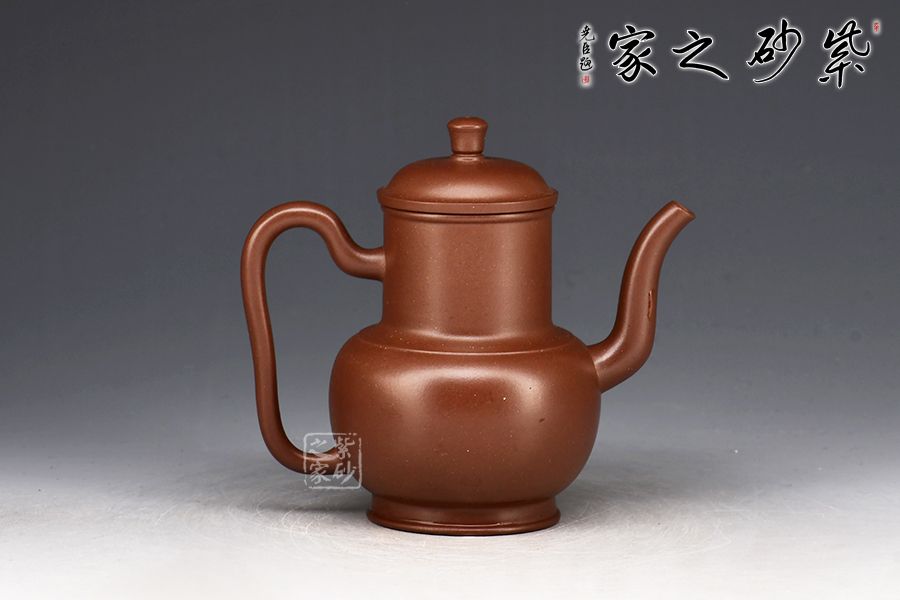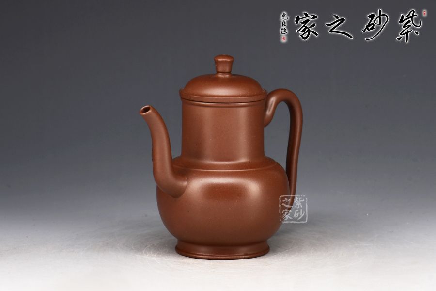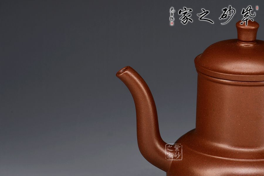 此壺形制獨(dú)特,器形優(yōu)美,紫砂泥料精煉,作高身酒壺。曲把線條流暢,壺流纖長(zhǎng),笠帽作蓋,壺鈕與壺足呼應(yīng),制作精工考究。此類酒壺由于胎體纖薄,傳承中極易損壞,如此好品相極為難得。