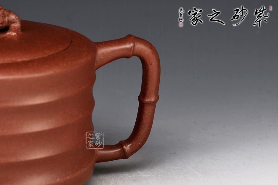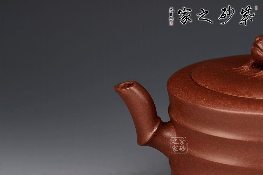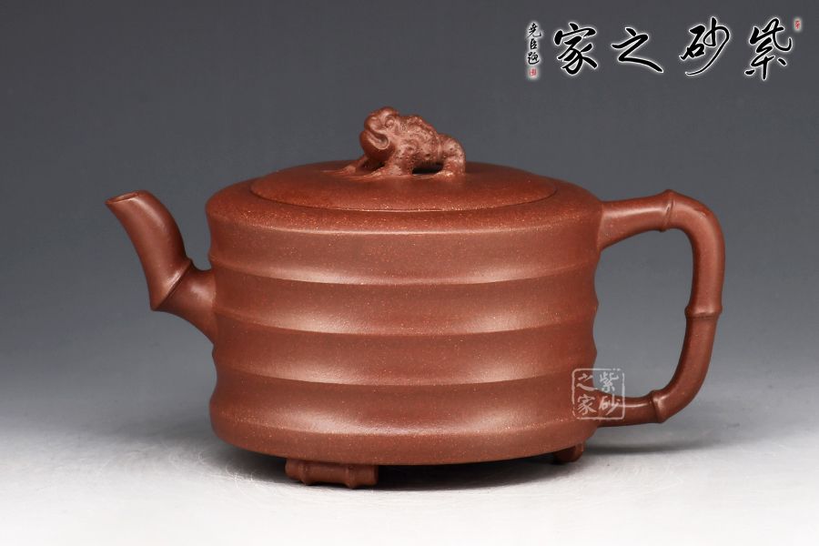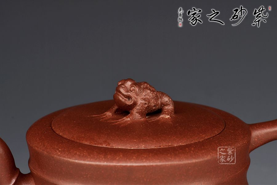 此招財進寶壺,融入了多種元素,如瑞獸“金蟾”、四君子之一“竹子”。老師獨具匠心的創(chuàng)作手法,使得多元素的壺型,不但沒有讓人眼花繚亂,反而彰顯出器物充滿靈性的態(tài)度。壺身、壺嘴、壺把均是竹段造型,虬曲有力,高風亮節(jié)。嵌蓋設計,嚴絲合縫,壺鈕以一只三足金蟾做壺鈕,形象生動,有著招財進寶、鎮(zhèn)宅、驅邪、旺財?shù)拿篮迷⒁?,呼應壺名?/p>