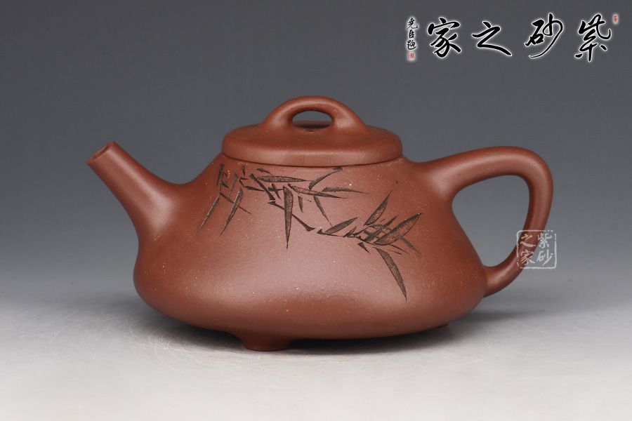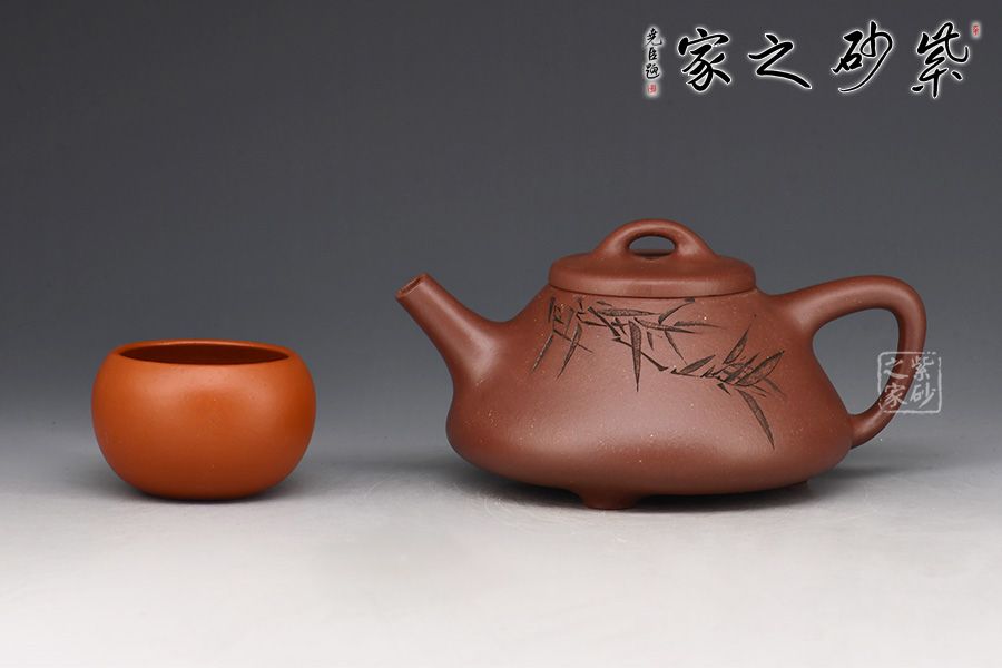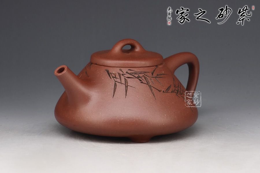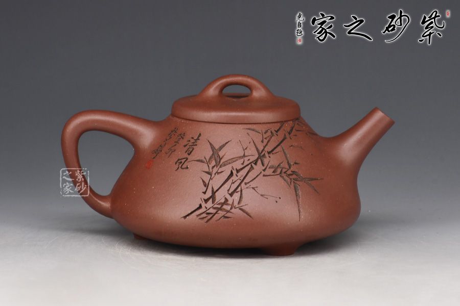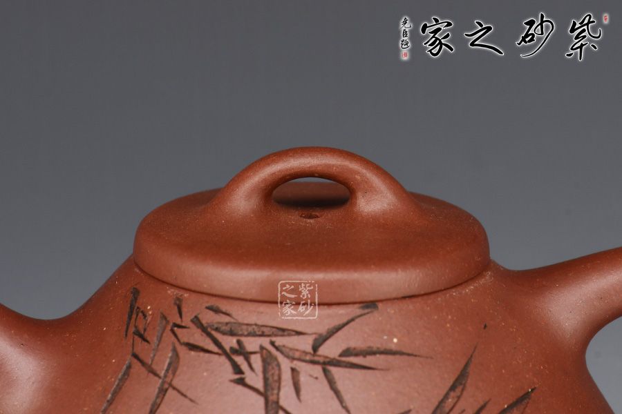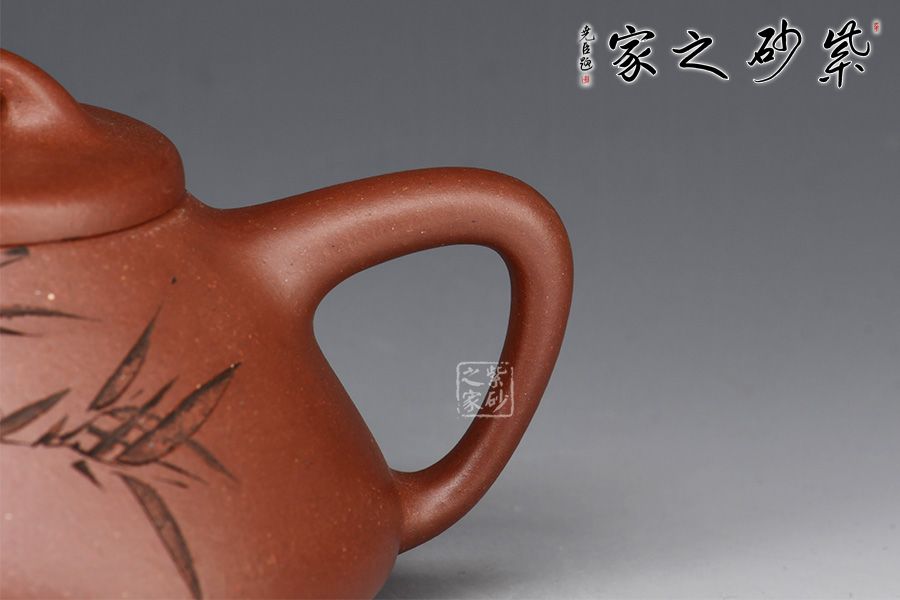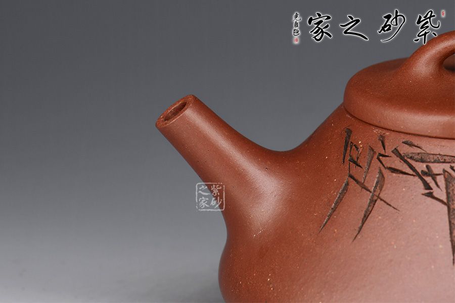 此壺為作者摹古而作,取經典子冶石瓢之型,采用原礦底槽青精制而成,泥色溫潤樸雅。整體造型簡約大方,壺身呈金字塔形,豐潤飽滿,壓蓋之上以橋鈕裝飾,直流簡而有力,出水順暢,壺把呈倒三角勢,與壺身之型互補,形成和諧的美學效果。壺身滿刻翠竹,清韻流長、秀雅明快。工藝精巧,刻畫入微,實用性佳,是一把賞玩皆宜的文人壺佳作。