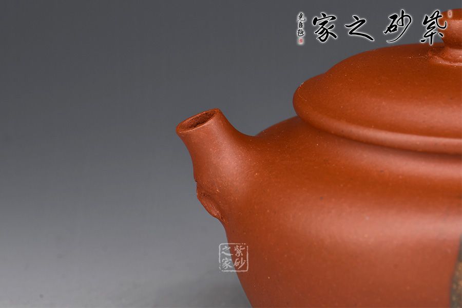 此壺以原礦清水泥作胎,泥色明潤(rùn),伴以粒粒金砂,透出古樸之味。壺身圓碩,線條流暢。直流壺嘴拙味濃厚,耳把端握合適,大口蓋,好投茶,柱形壺鈕,簡(jiǎn)單自然,妙趣無(wú)窮。