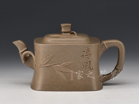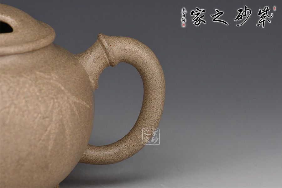 竹枝桿挺拔,修長,四季青翠,凌霜傲雨,倍受中國人民喜愛,有“梅蘭竹菊”四君子之一,“梅松竹”歲寒三友之一等美稱。老師以竹入,壺嘴壺把皆是竹節(jié),每節(jié)竹段長度、粗細(xì)錯(cuò)落有致,十分符合竹子自然狀態(tài)下的特點(diǎn)。整壺圓潤飽滿,線條柔和流暢,壺蓋上兩個(gè)對稱的橢圓型孔,似牛之雙目,炯炯有神,氣韻生動。300cc的黃金容量,方便把玩。