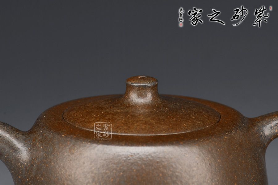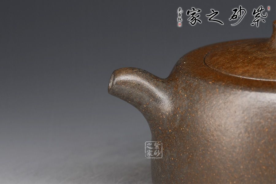 此壺為作者選用原礦黃金段為胎,柴燒而成,若隱若現(xiàn)的金砂,彰顯古樸之味。壺身以井欄為型,線條圓潤(rùn)有力,簡(jiǎn)潔明快。穹起的壺蓋之上,柱形鈕挺拔矗立。彎流俊俏胥出,出水爽利,耳把方圓并濟(jì),端莊大氣。整器形制優(yōu)美,剛?cè)岵⑹诠艠阒酗@雅致,氣韻內(nèi)斂,雋永耐看。