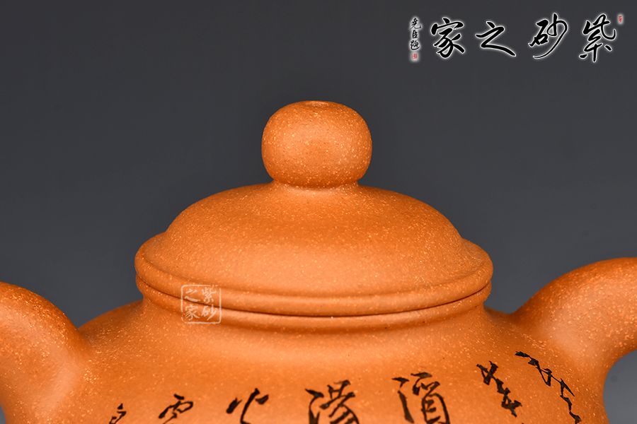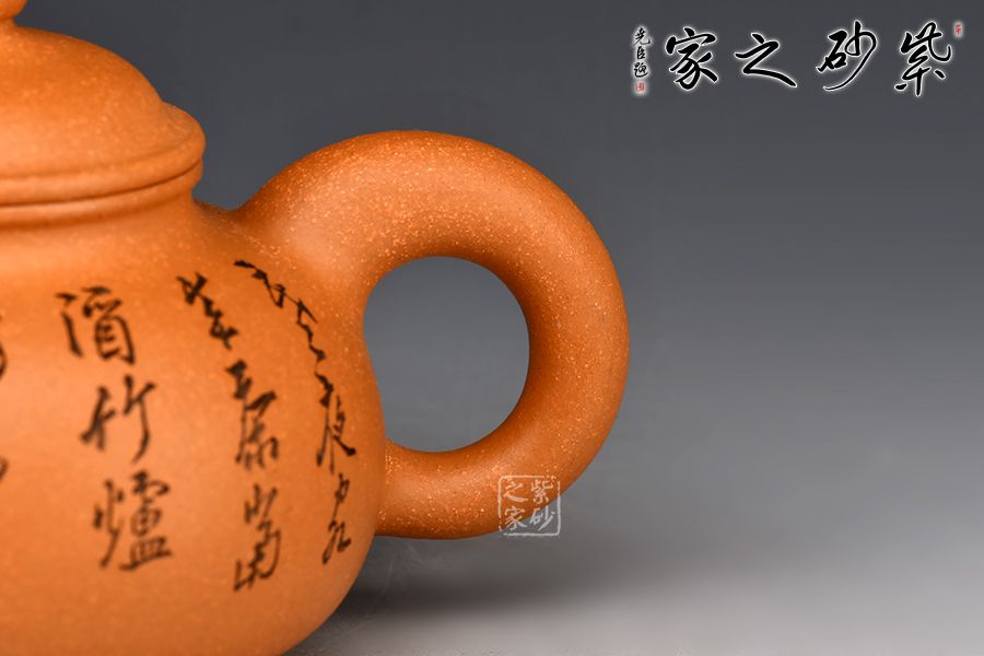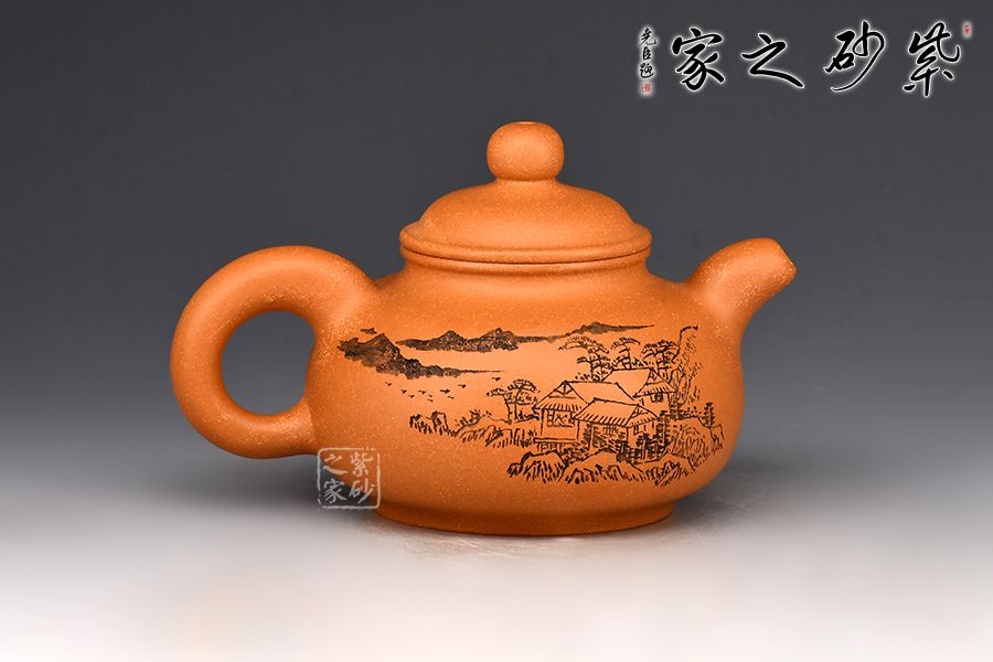 此壺造型小巧美妙,刻繪的景色怡人,精工細(xì)致,讓人把玩欲罷不能。壺身扁圓可愛,輪廓明朗,圈足和壺頸上下對應(yīng),美感頓生。壓蓋的子母線對仗工整,嚴(yán)絲合縫。珠型壺鈕由鼓蓋拱衛(wèi),精巧圓滑,似稀世珍寶。壺嘴和壺把渾圓短粗,氣質(zhì)沉穩(wěn),非常有古典的韻味。通身來看,此壺之精妙寓巧于拙,越是把玩越覺韻味無窮。