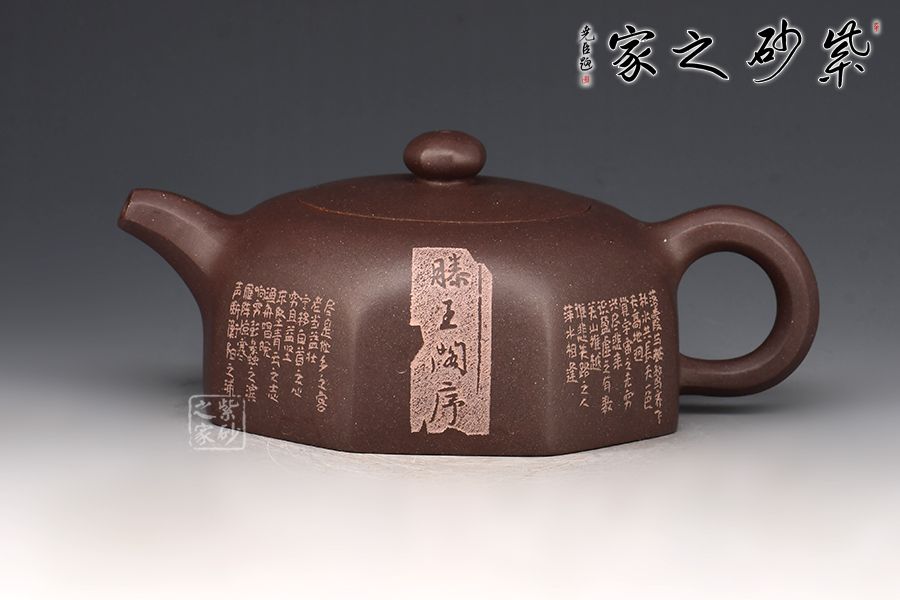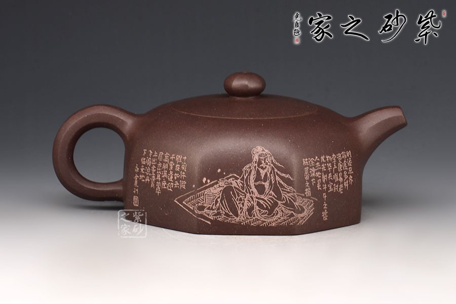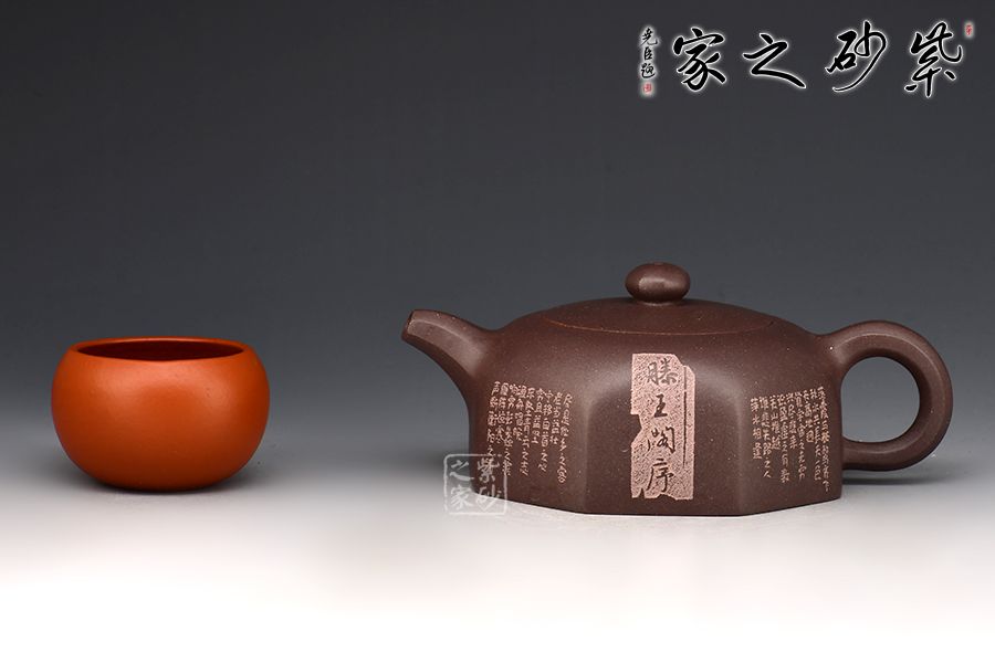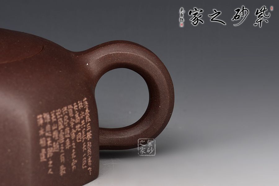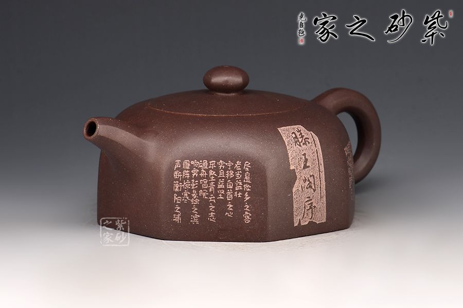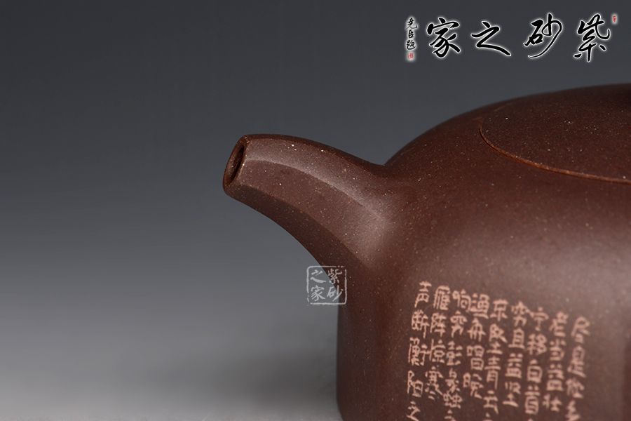 此壺是在六方井欄的基礎(chǔ)上演變出的八方井欄,造型簡(jiǎn)潔。壺嘴順收微揚(yáng),出水爽利,耳把粗細(xì)有致。嵌蓋層次分明且氣密性佳,圓珠鈕小巧可愛。整器方中有圓,圓中寓方。