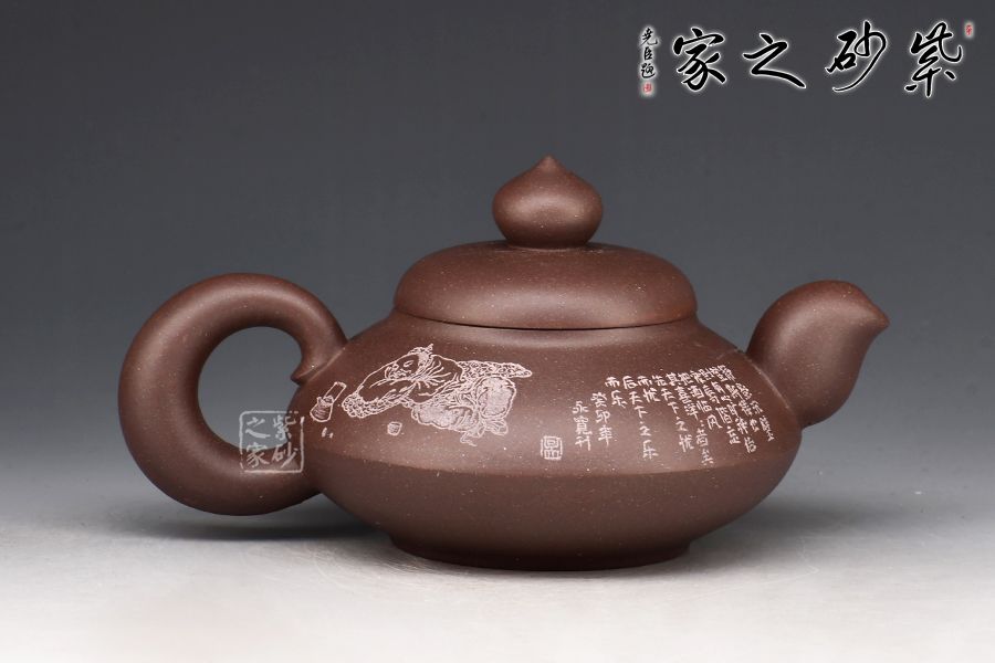 此壺為玉成窯合歡壺,玉成窯是繼曼生壺之后,又一文人壺的高峰,此件合歡壺式亦是如此。作者精工摹古,細(xì)節(jié)處理得宜。壺身上下相合,相交處線條平和利落,截蓋、水滴鈕,流、把憨厚樸拙,壺身由名家吳永寬陶刻裝飾,刀工精湛,佳器一把。