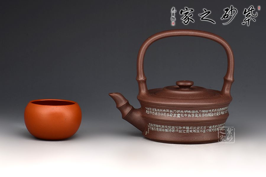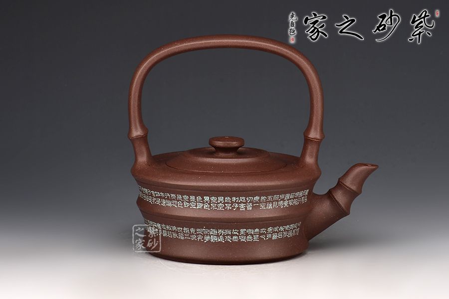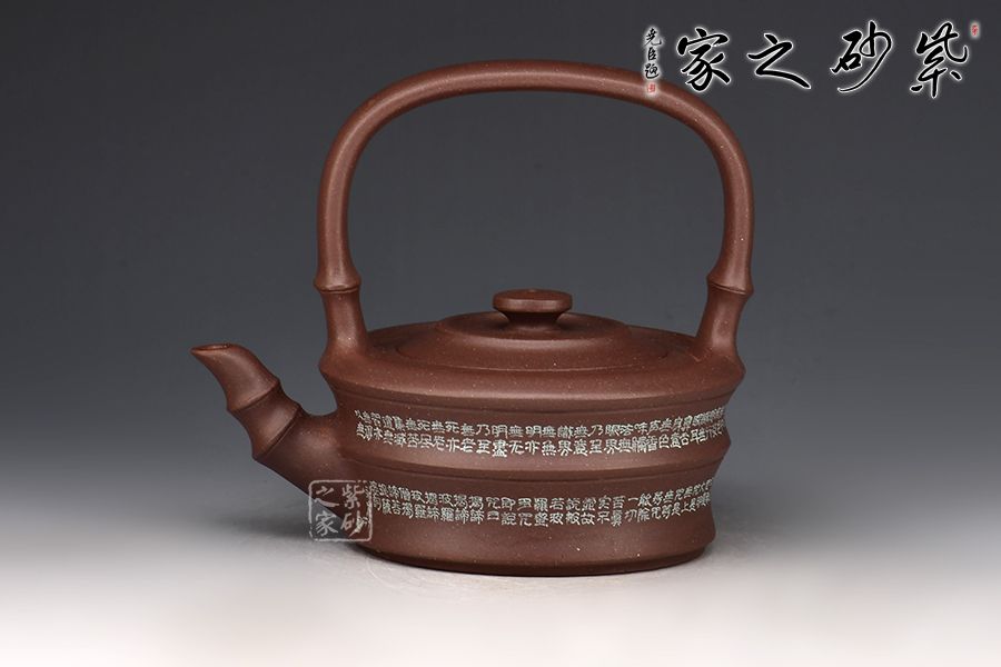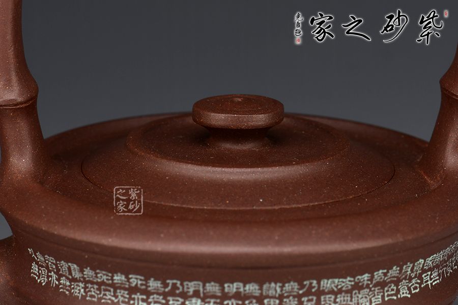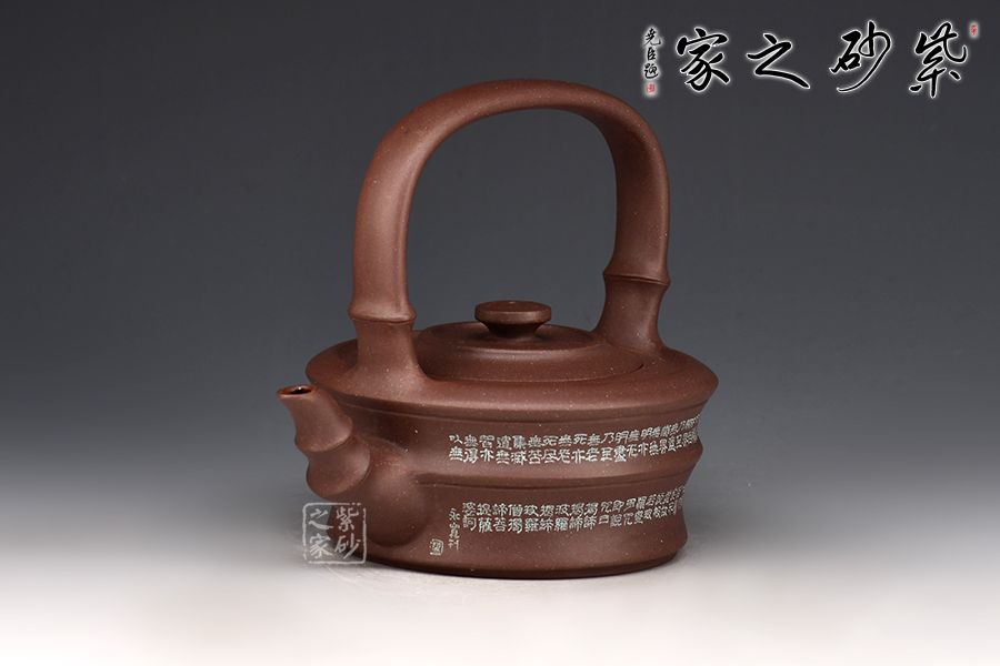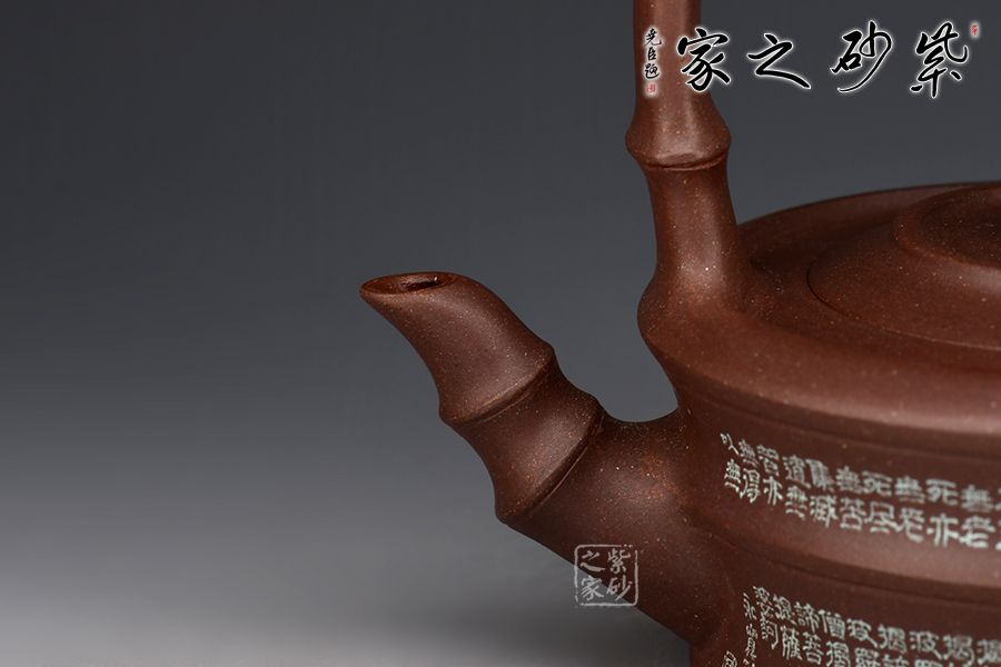 此器以竹為題材,壺身塑以竹節(jié)狀,刻繪裝飾。大口蓋,圓盤鈕。三竹節(jié)的壺嘴,敦厚樸實(shí);竹節(jié)提梁,曲直有度,與壺體之間形成了虛實(shí)結(jié)合的空間之美。