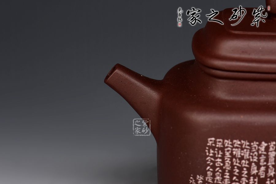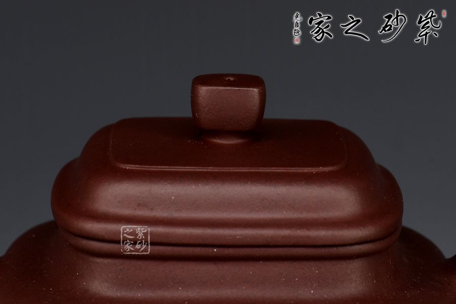 壺身飽滿,韻律和諧,直頸。壺蓋向上鼓起,口蓋吻合嚴密,氣密性好;壺鈕略呈四方形,與壺身一致,流把方圓相濟,比例勻稱,氣勢渾成。