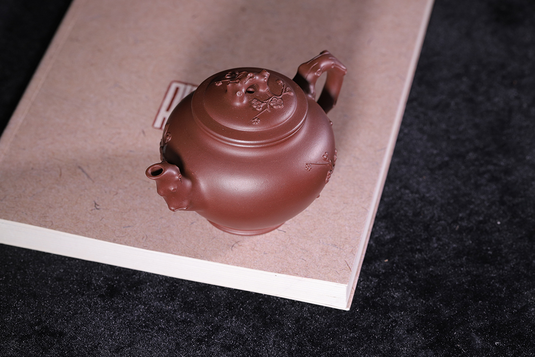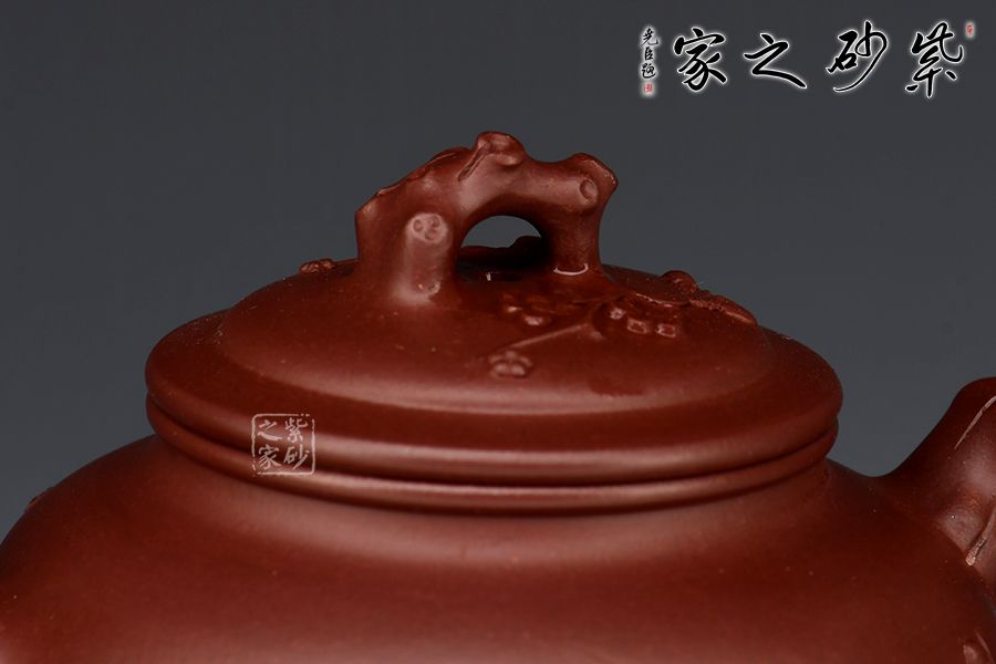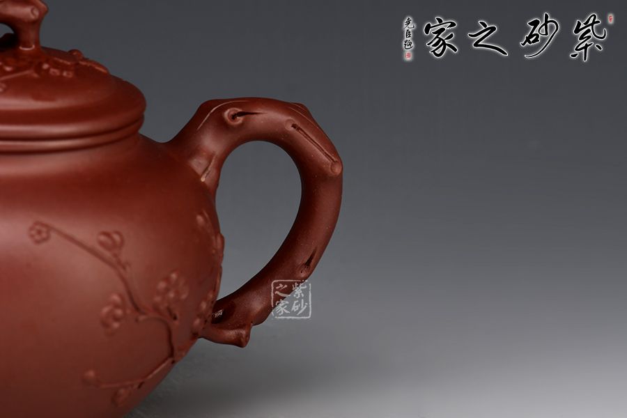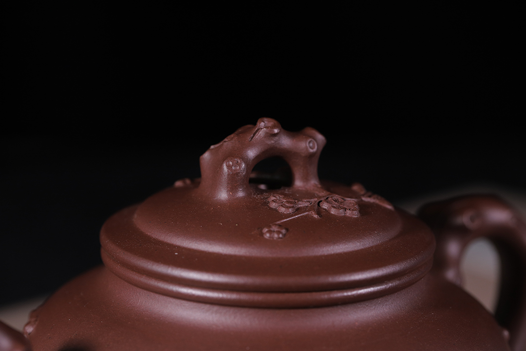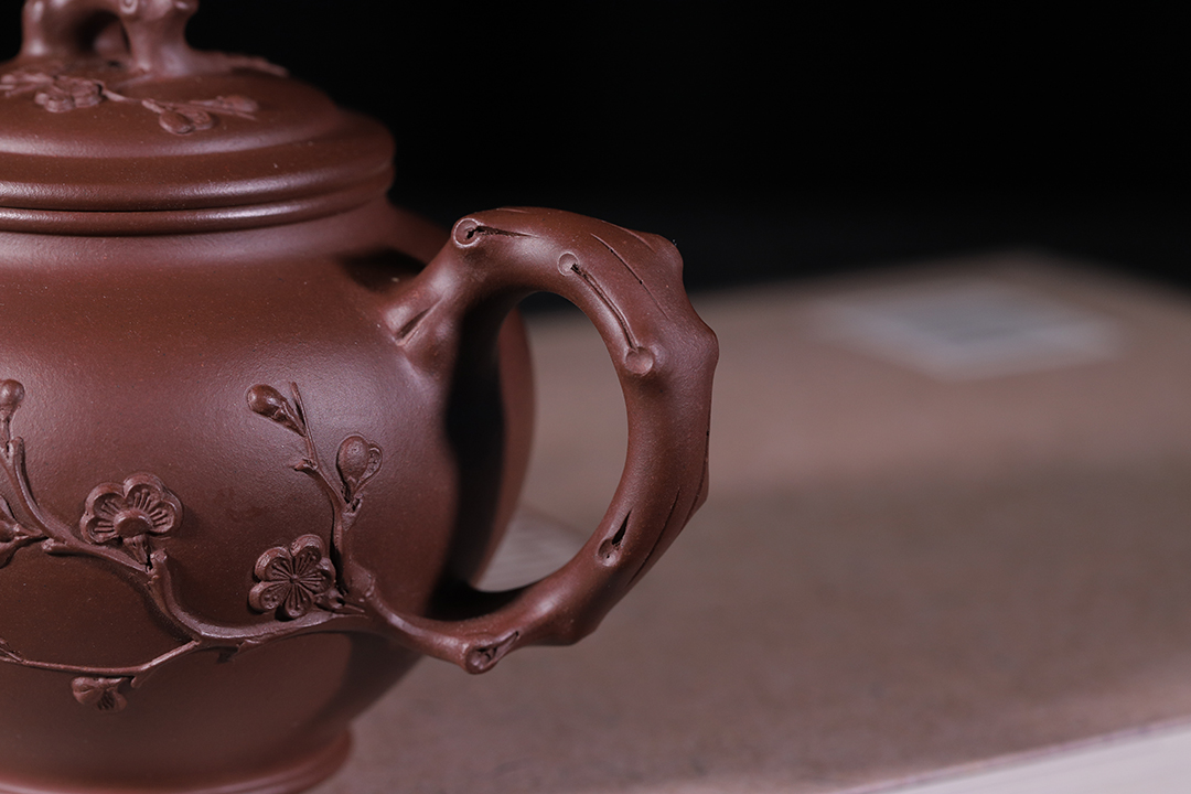 此“報(bào)春”是以梅花報(bào)春為主題,在挺秀飽滿的圓形壺身上,運(yùn)用雕刻和捏塑等多種手法,生動(dòng)地刻畫了梅花不畏風(fēng)霜嚴(yán)寒,依然俏麗生姿的精神面貌。