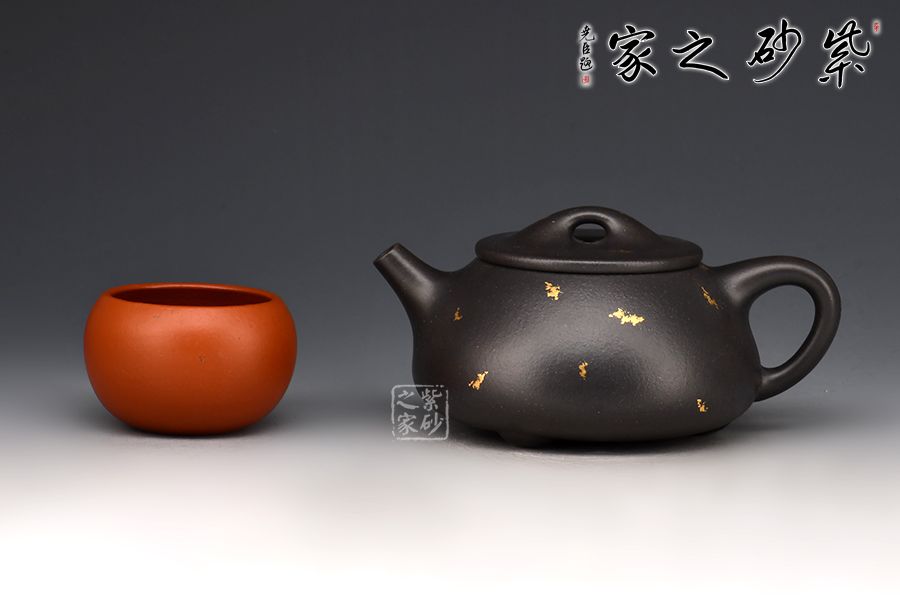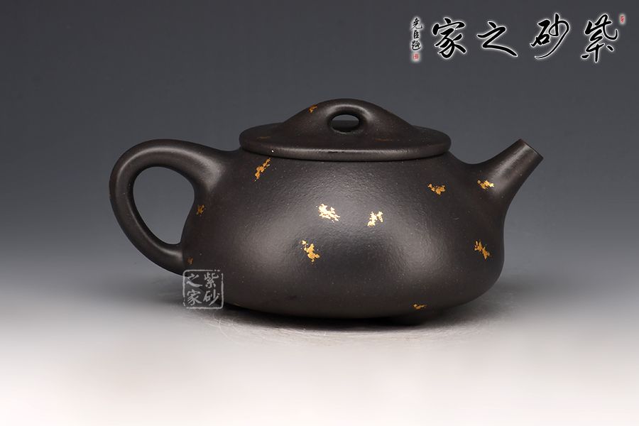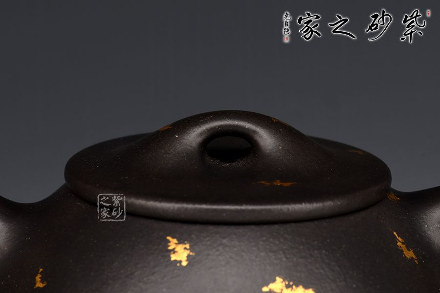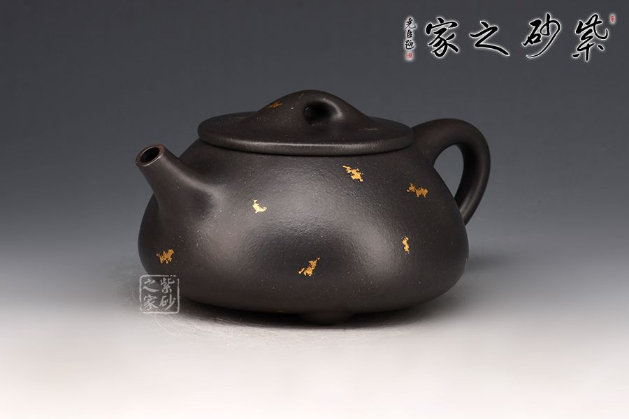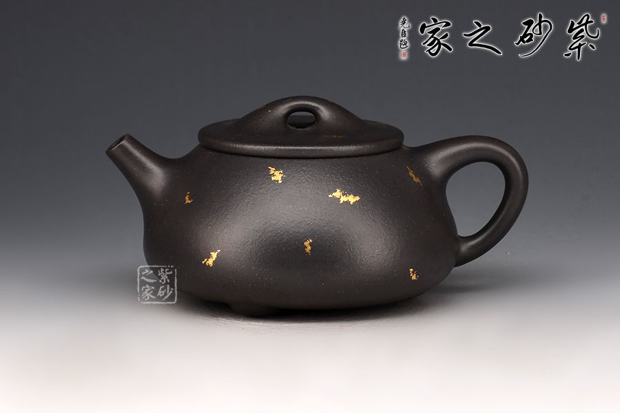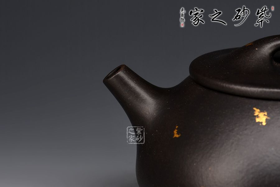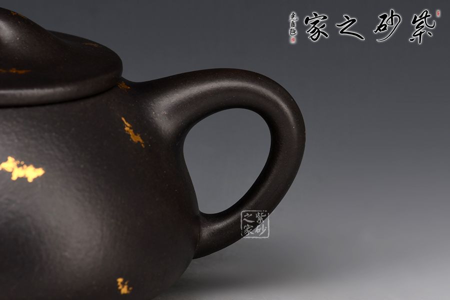 采用了原礦底槽清為胎,還原燒燒而成。經(jīng)典的景舟石瓢壺型,壺身呈三角形,形態(tài)雅致,舒展挺拔,端莊穩(wěn)重,柔中帶剛;線條飽滿,壺底部與壺腹部乃是小弧面圍繞而成,連成較為圓滑的圓錐體;壺嘴較為修長,直挺胥出,挺括有力,狀似喇叭,出水沖勁十足;暗接三角形端把剛毅有力,尖端轉(zhuǎn)折圓潤,十分稱手;壺底三足圓潤精巧,穩(wěn)重鼎立;口蓋較薄,壺鈕為散開的三角形大鈕,圓弧感明顯,與蓋的交接處似明似暗,功力老道。戧金工藝裝飾,富貴華麗。