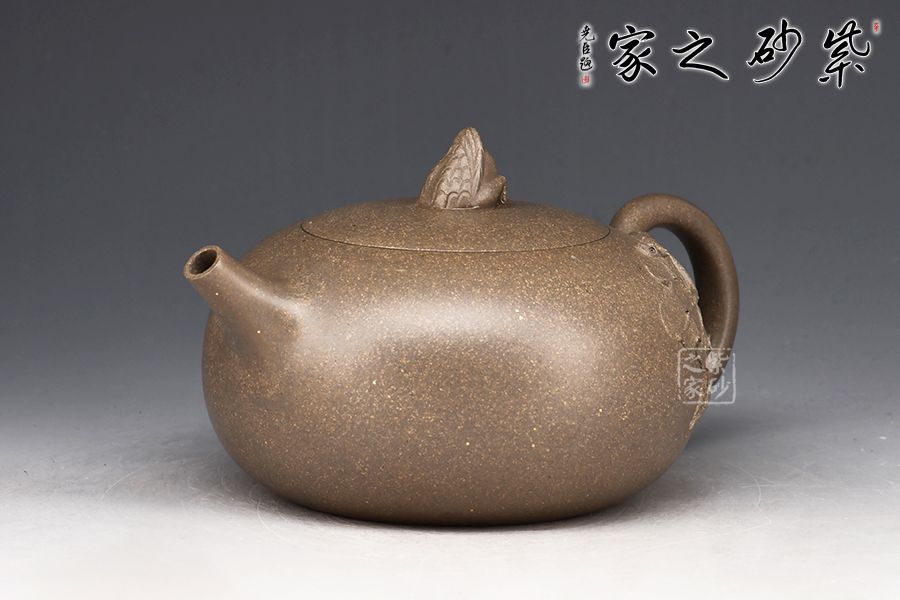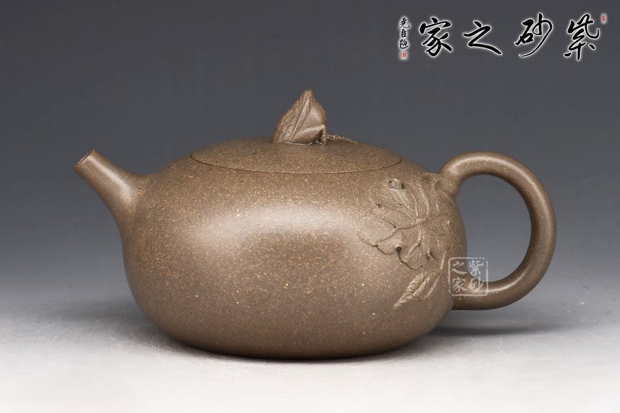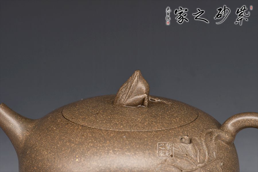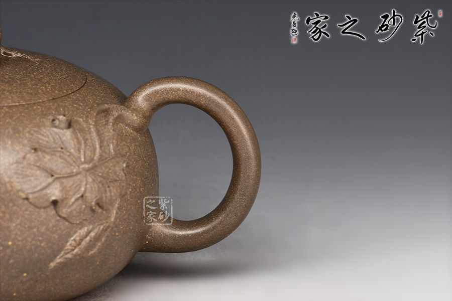 壺鈕塑一鴨子探水捕魚(yú),靈動(dòng)可愛(ài),壺把塑荷葉貼繪,栩栩如生。整器生動(dòng)有趣,畫(huà)面感十足…