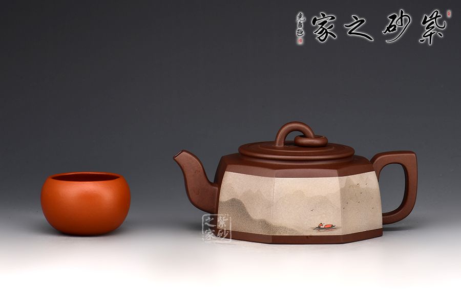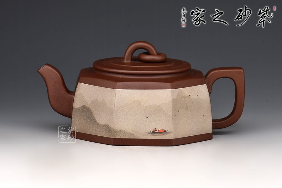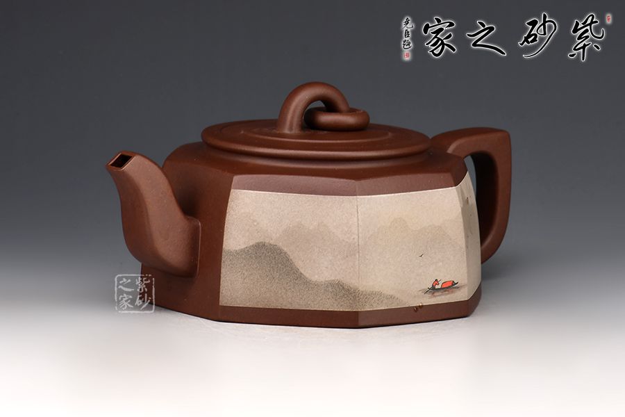 《漁舟唱晚》本是一首頗具古典風(fēng)格的箏曲,以此命名此壺,毫無違和感,壺身描繪了一幅夕陽映照萬頃碧波,漁民悠然自得,漁船隨波漸遠(yuǎn)的優(yōu)美景象。彎流、耳形把,橋型鈕加圈設(shè)計(jì),使此壺簡潔大方,意境深遠(yuǎn)。