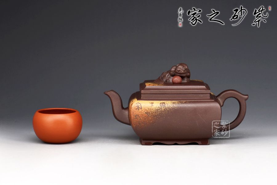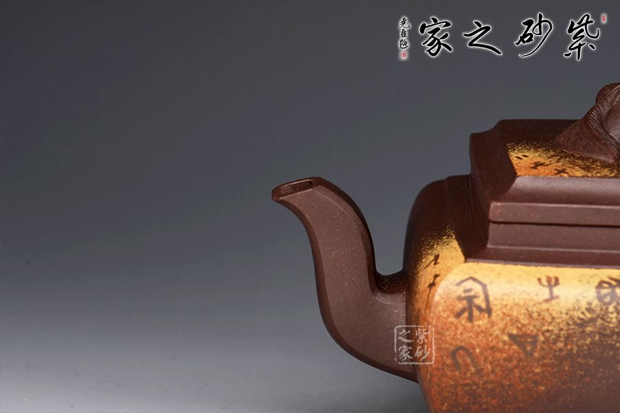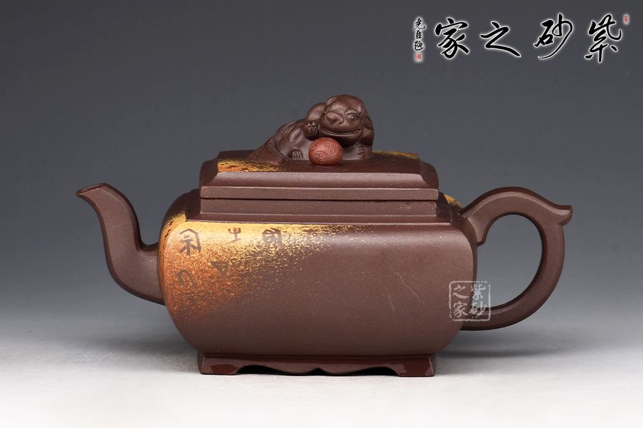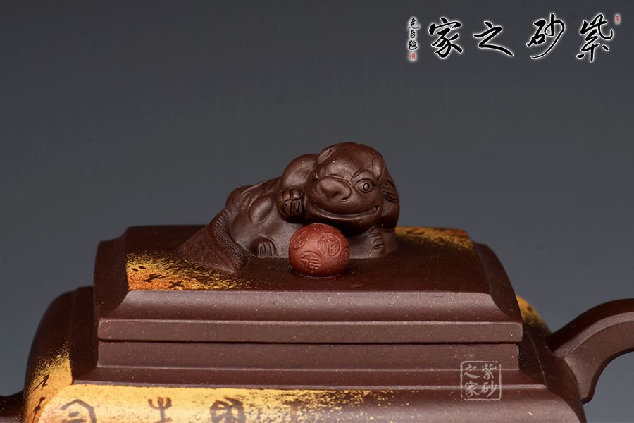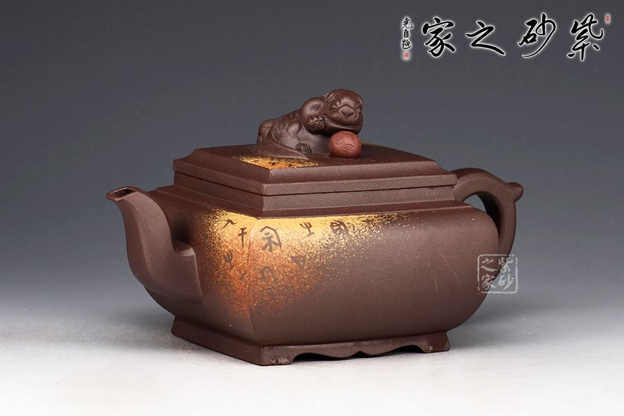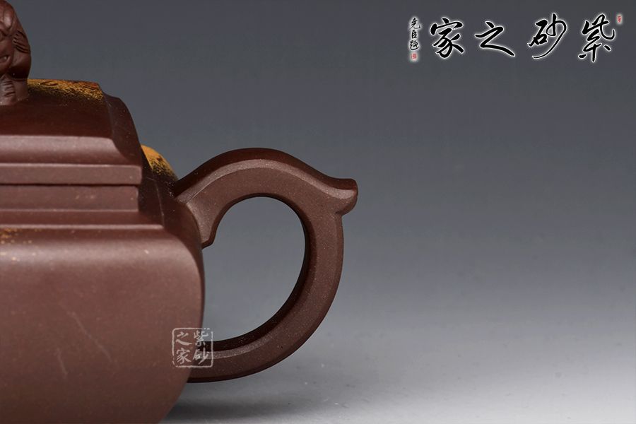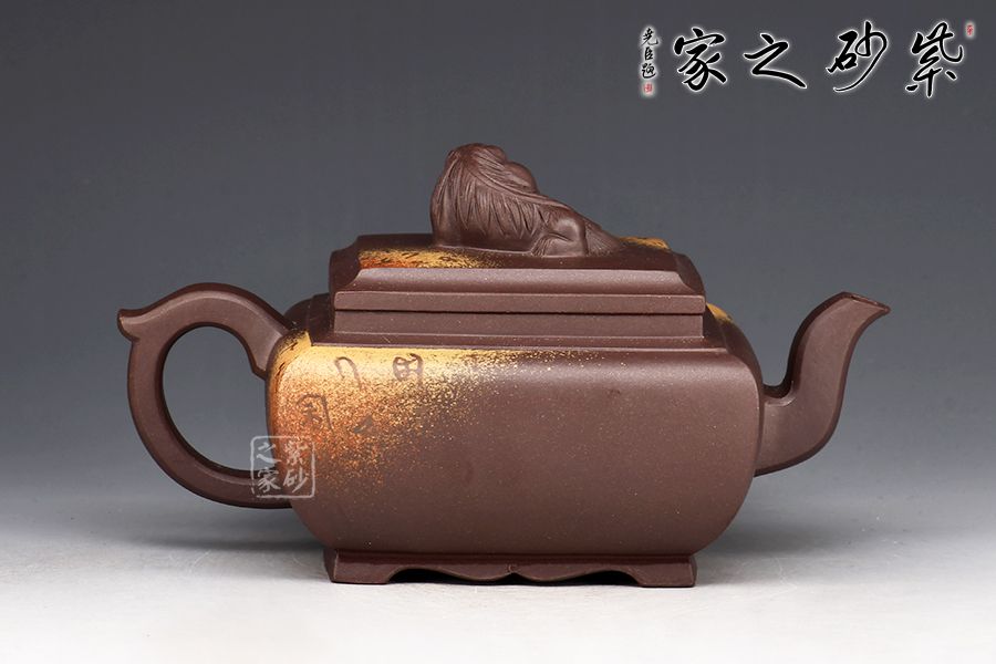 此壺將獅球壺和方器結(jié)合,泥料堅(jiān)致,呈深紫色,壺身四方,彎流耳把,蓋與口嚴(yán)絲合縫,面與面貼合緊密,蓋鈕塑以伏獅,信手拈來(lái),氣暢神怡又憨態(tài)可掬。