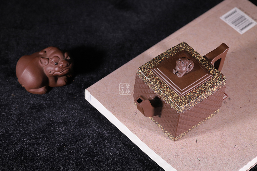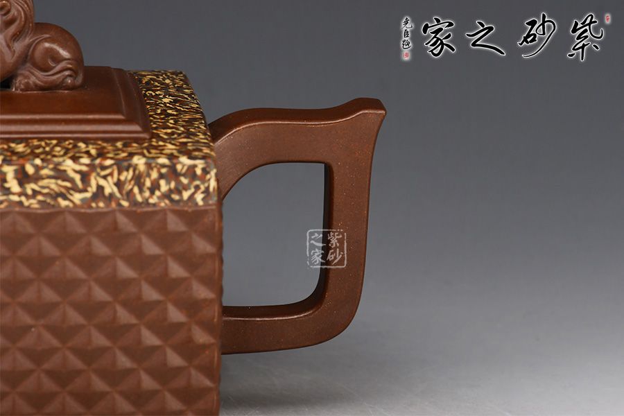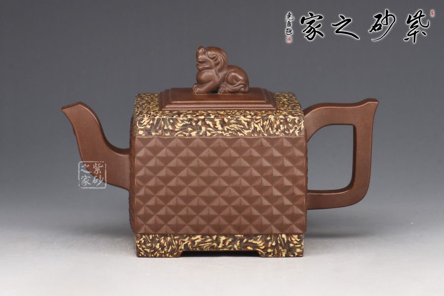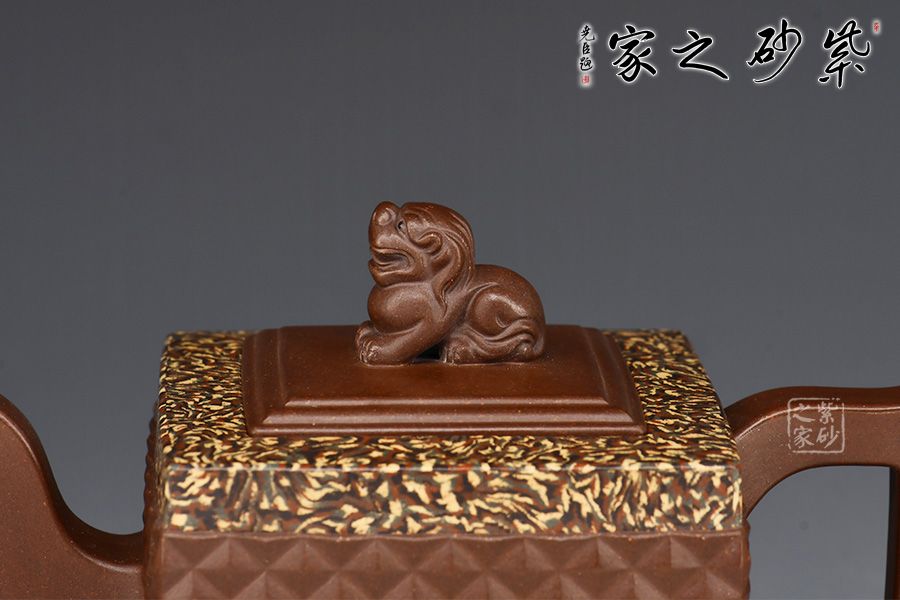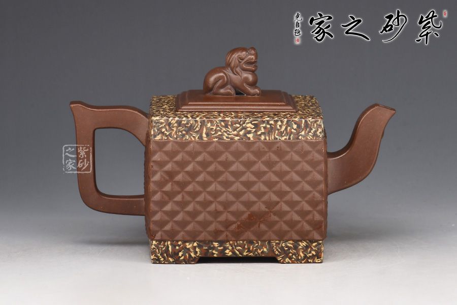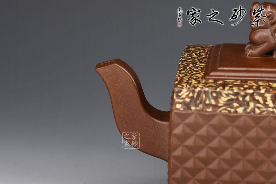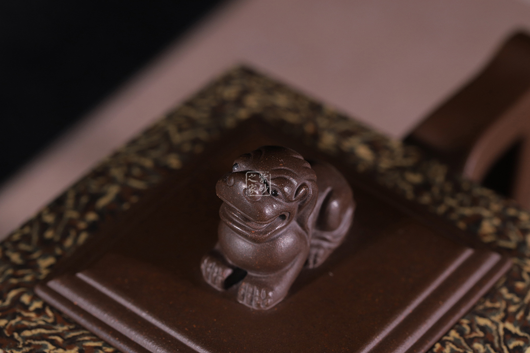 此《鉆獅壺》秉承了孔小明老師一貫的大氣風(fēng)格,以我國(guó)古代的鎮(zhèn)宅瑞獸作為創(chuàng)作主題。整壺以四方定型,線條剛正硬朗,壺把與壺嘴照應(yīng)壺身,做成方形,一掃陰靡纖弱之風(fēng)。