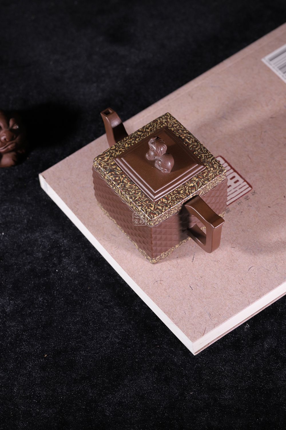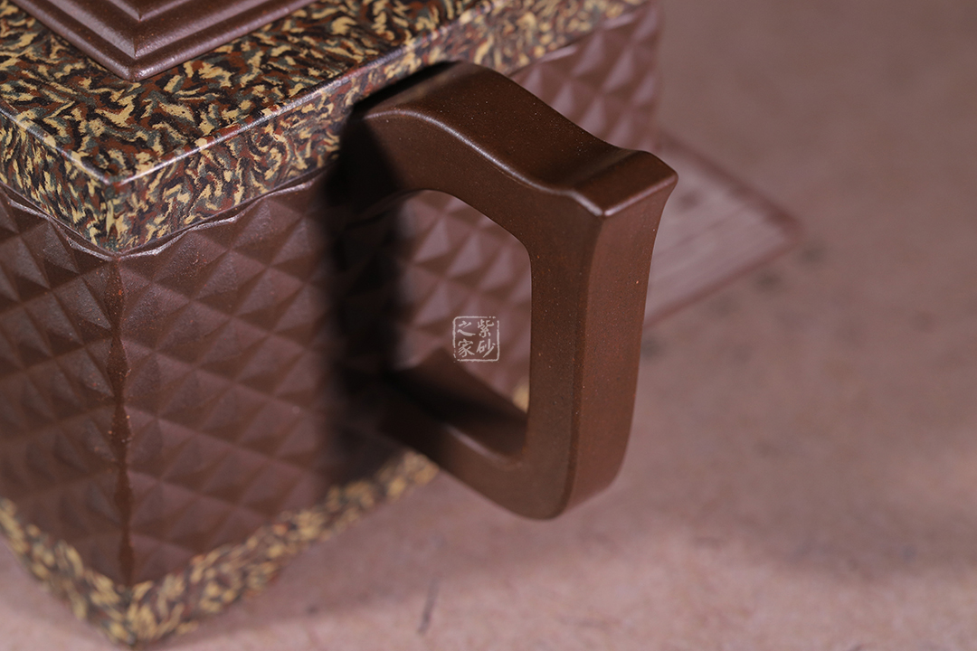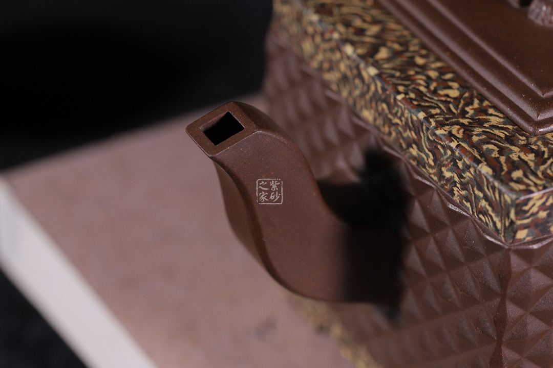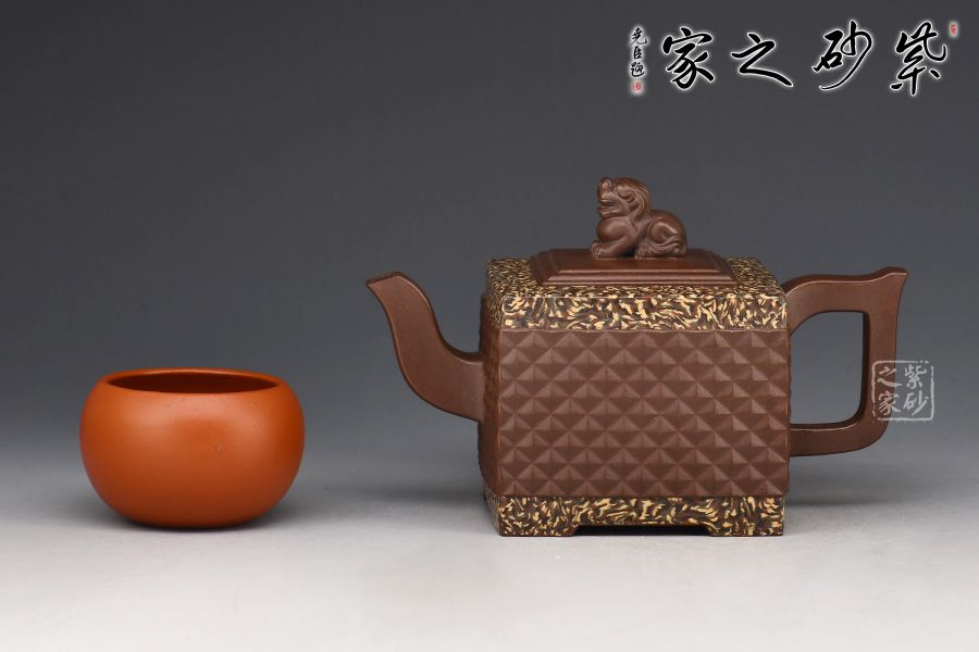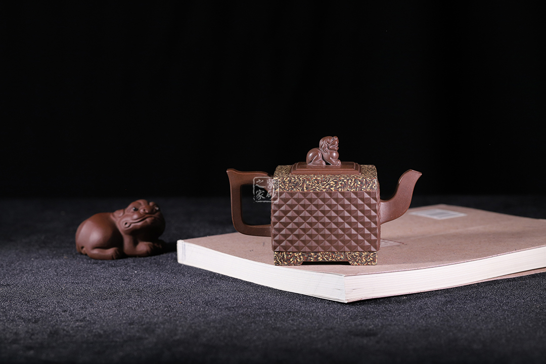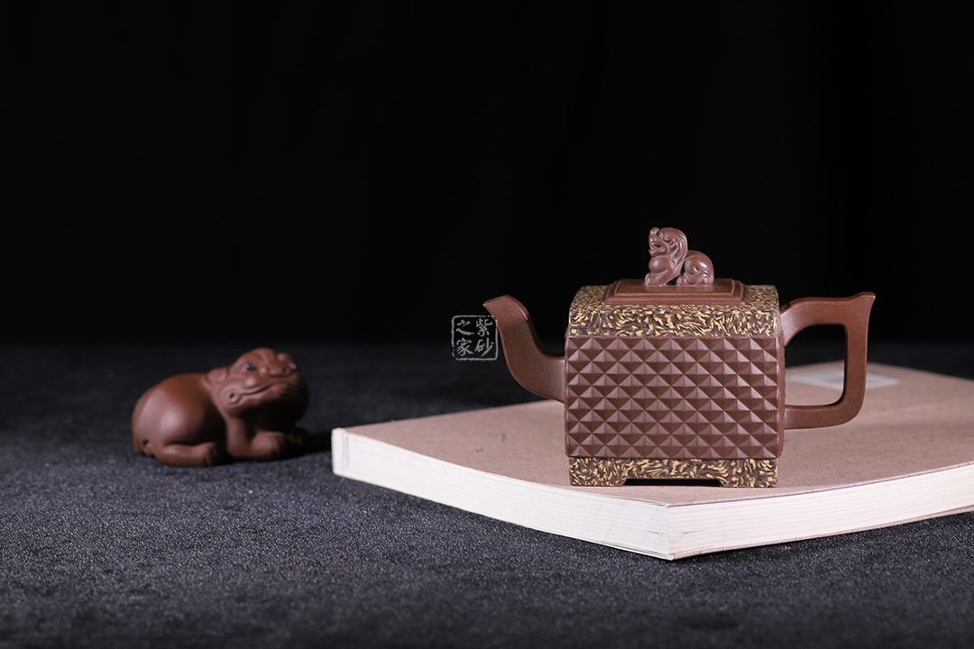 此《鉆獅壺》秉承了孔小明老師一貫的大氣風(fēng)格,以我國(guó)古代的鎮(zhèn)宅瑞獸作為創(chuàng)作主題。整壺以四方定型,線條剛正硬朗,壺把與壺嘴照應(yīng)壺身,做成方形,一掃陰靡纖弱之風(fēng)。