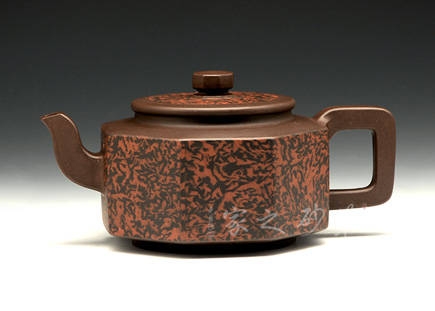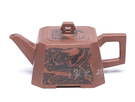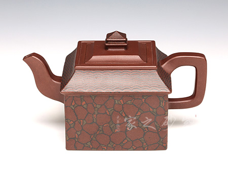 紫砂絞泥是采用兩種或兩種以上不同顏色的紫砂泥,經(jīng)人工揉合、按壓、層疊、鑲嵌等多種手法絞和而成,再通過拍打泥片,并按要求切割泥片、鑲接泥片, 直至打 好身筒,這樣便在壺身上形成不規(guī)則卻十分自然和諧的紋飾圖案,如天際流云、似雨后彩虹;如湖光山色、似大漠原野等等,這些雖在小小的壺面上呈現(xiàn)出虛虛實實的圖象,卻能以小見大地營造出亦真亦幻、自然天成的意境,這正是紫砂絞泥具有的裝飾性。
