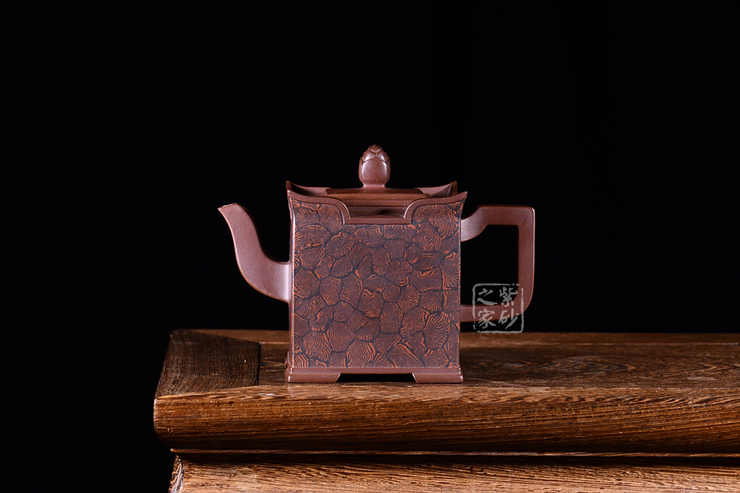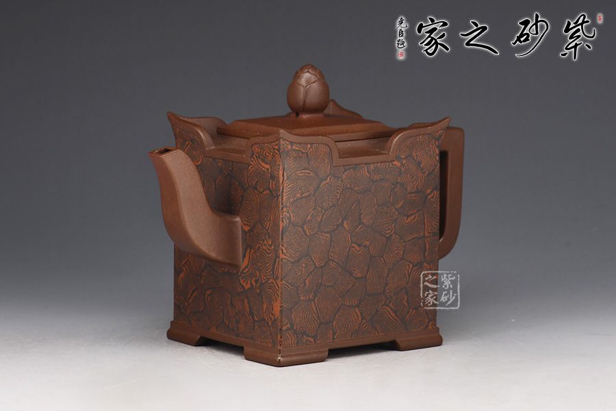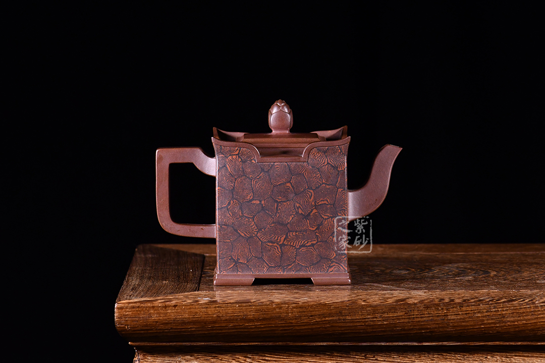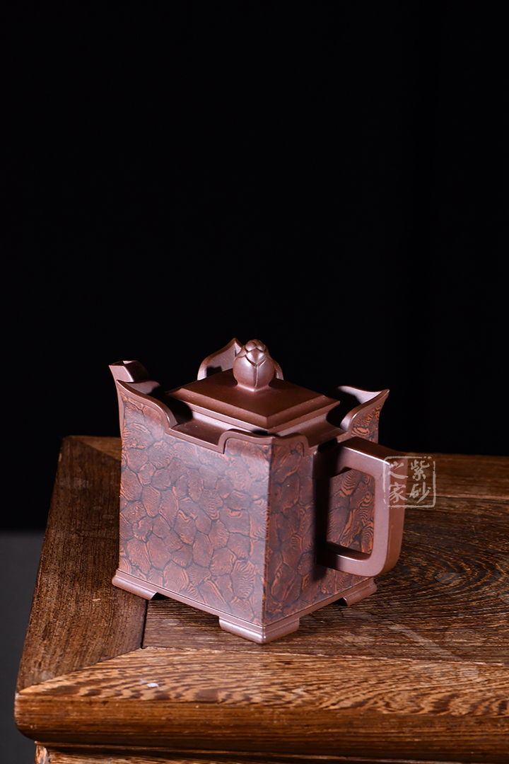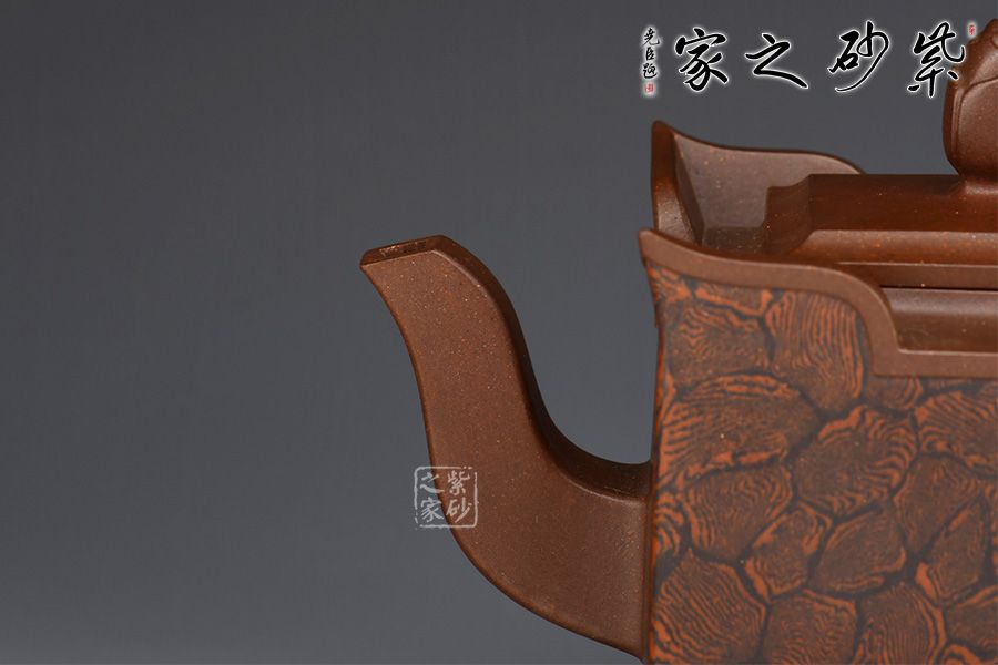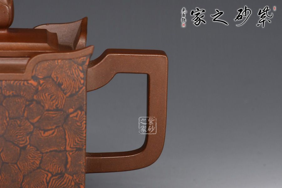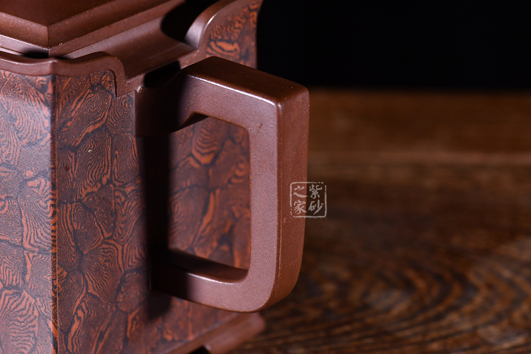 此壺以四方壺為形,身筒高挺端正。壺的所有部位與壺形體相稱,剛?cè)岵?jì),流把與壺身保持一致,,線條流暢自然,線面挺括平整,有棱有角。壺蓋與壺口相對(duì),此壺的亮點(diǎn)在于壺鈕,與壺身整體像一個(gè)修行的僧人,清心寡欲。