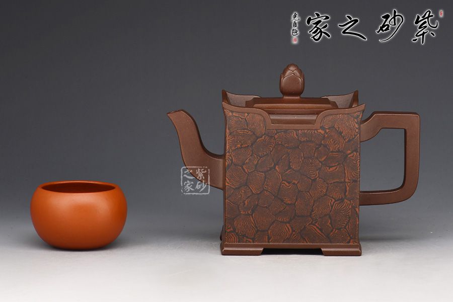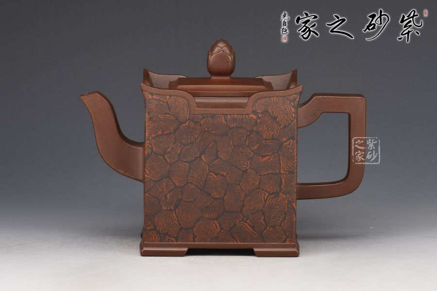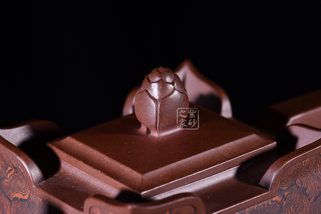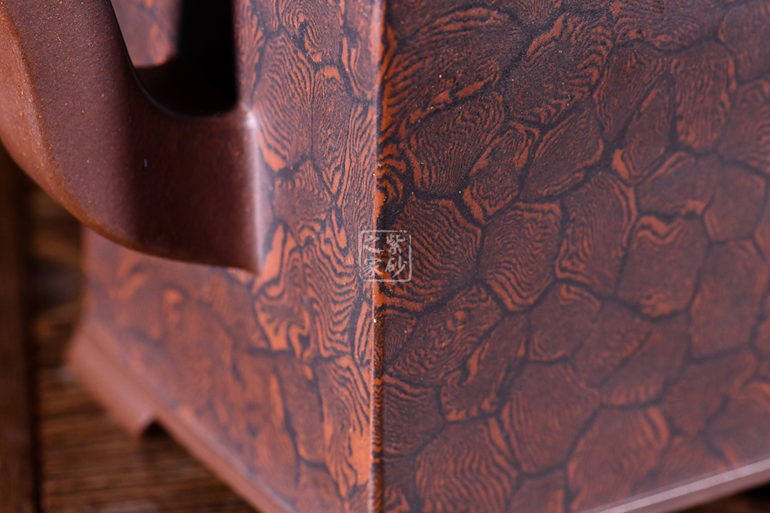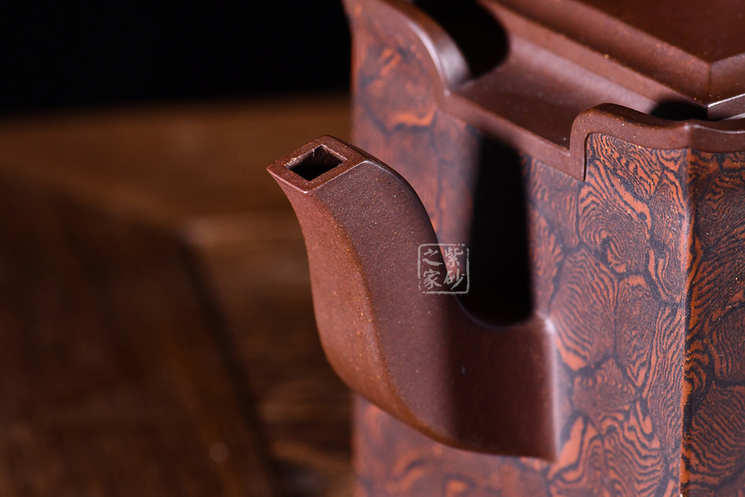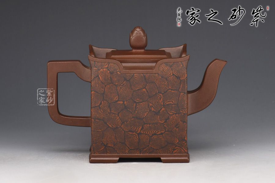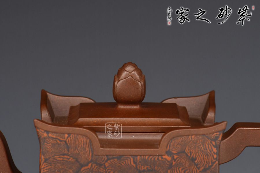 此壺以四方壺為形,身筒高挺端正。壺的所有部位與壺形體相稱,剛?cè)岵?jì),流把與壺身保持一致,,線條流暢自然,線面挺括平整,有棱有角。壺蓋與壺口相對(duì),此壺的亮點(diǎn)在于壺鈕,與壺身整體像一個(gè)修行的僧人,清心寡欲。