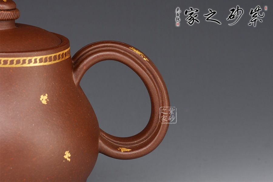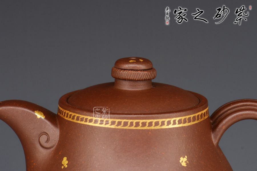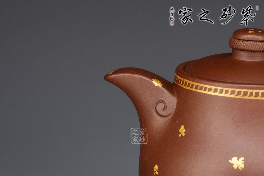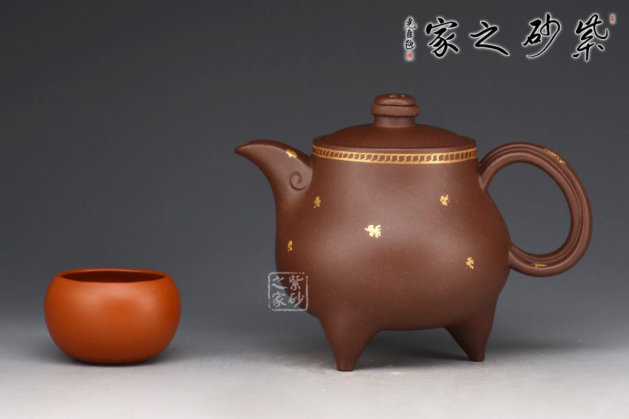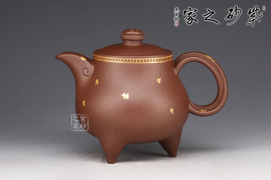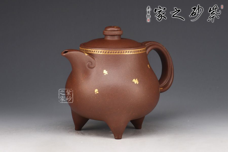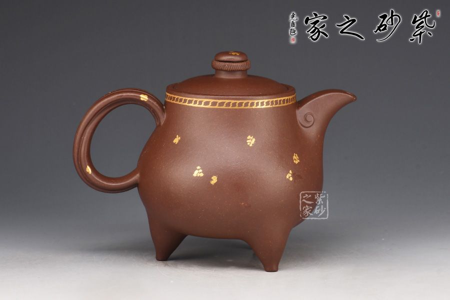 整壺色澤古樸,端莊大氣。壺身仿青銅器造型,壺身飽滿,下承三高足。壺身的撒金工藝和壺口處的描金裝飾,使此壺富貴亮麗,大氣凜然。