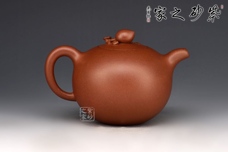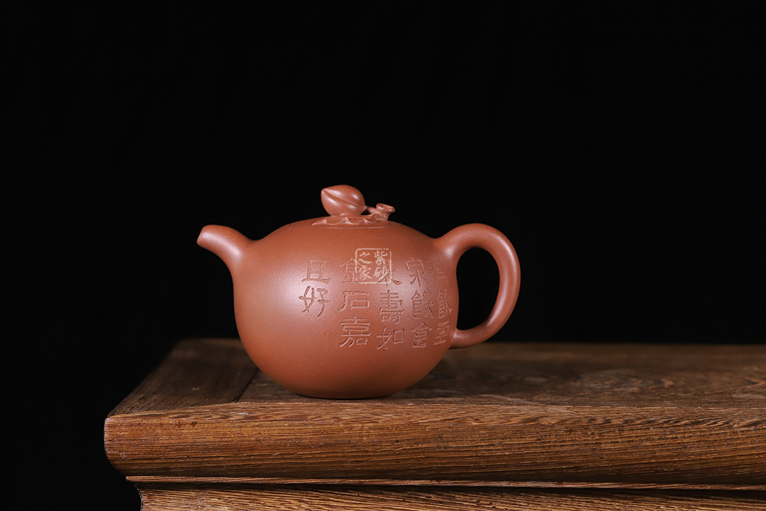 此壺名為壽桃,整個造型似一棵桃子,壺身圓潤飽滿,線條平緩而流暢,貼花工藝使得這棵桃子的形象更加逼真,壺鈕為一個小桃子,依托在桃枝上,讓人愛不釋手。