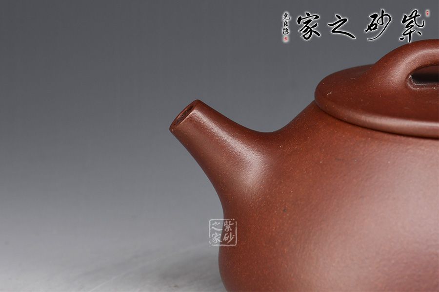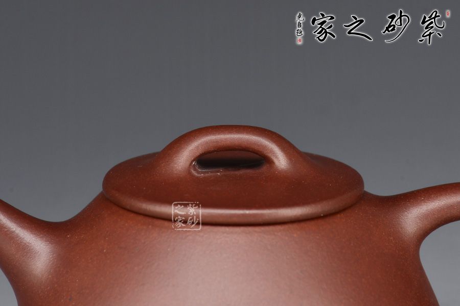 莊紅陽老師的這把壺繼承了傳統(tǒng)的精粹,整個壺身豐潤飽滿,由于重心下垂使用很穩(wěn)當(dāng),更具有極大的觀賞性,壺嘴的特色在于短小而有力,為直筒形,使出水更加有力量順暢,壺鈕采用常見的拱橋造型,使整款壺在簡單中多了一份活力,壺蓋與壺身嚴(yán)絲密縫使此壺具有極高的實(shí)用性。