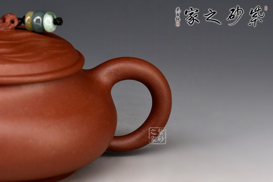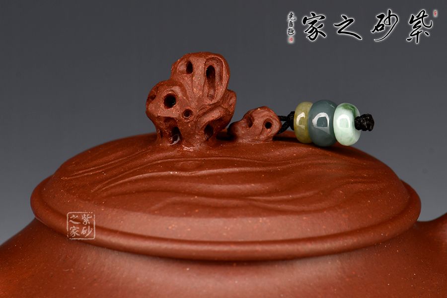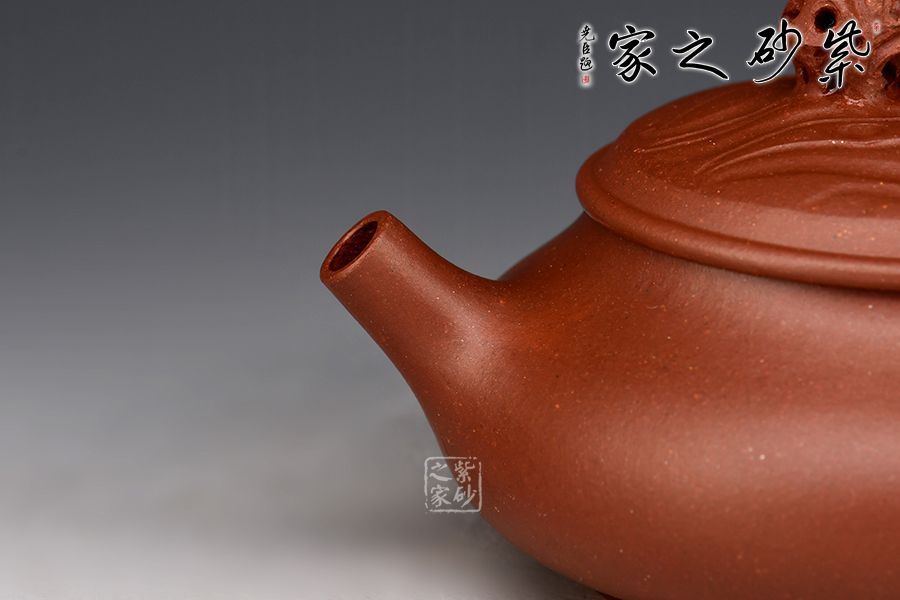 壺身略扁,上斂下豐,弧線過渡自然,肩部平滑,外形工整細(xì)膩,古樸雅致。直流嘴從壺身延伸出來,口沿上翹,嘴口平滑,粗細(xì)過渡柔美持重,古意十足。壺把為耳形,便于拿捏,其鈕更是點睛之作,以“太湖石”為形,猶如微型盆景中的假山褶皺自然,神韻俱佳。