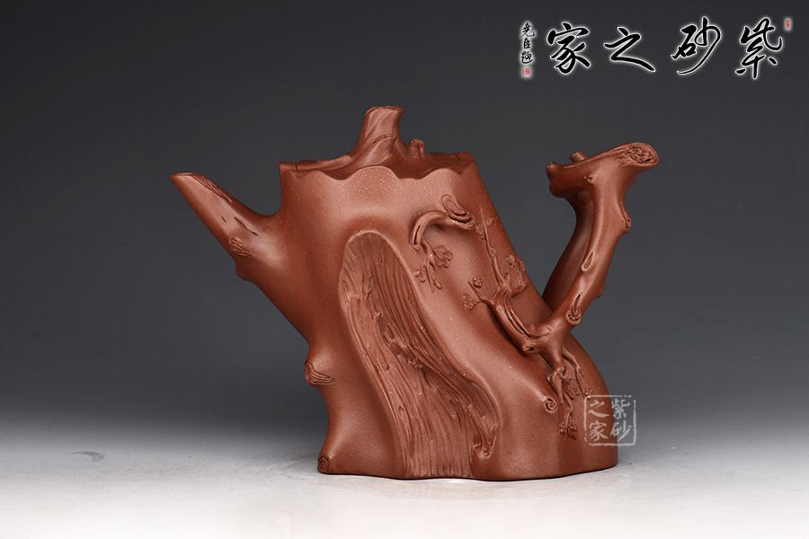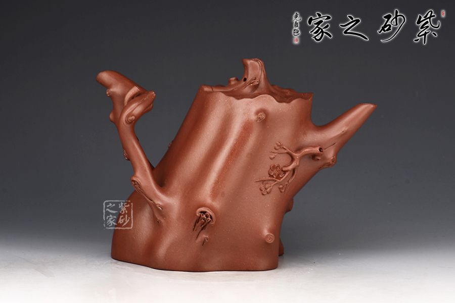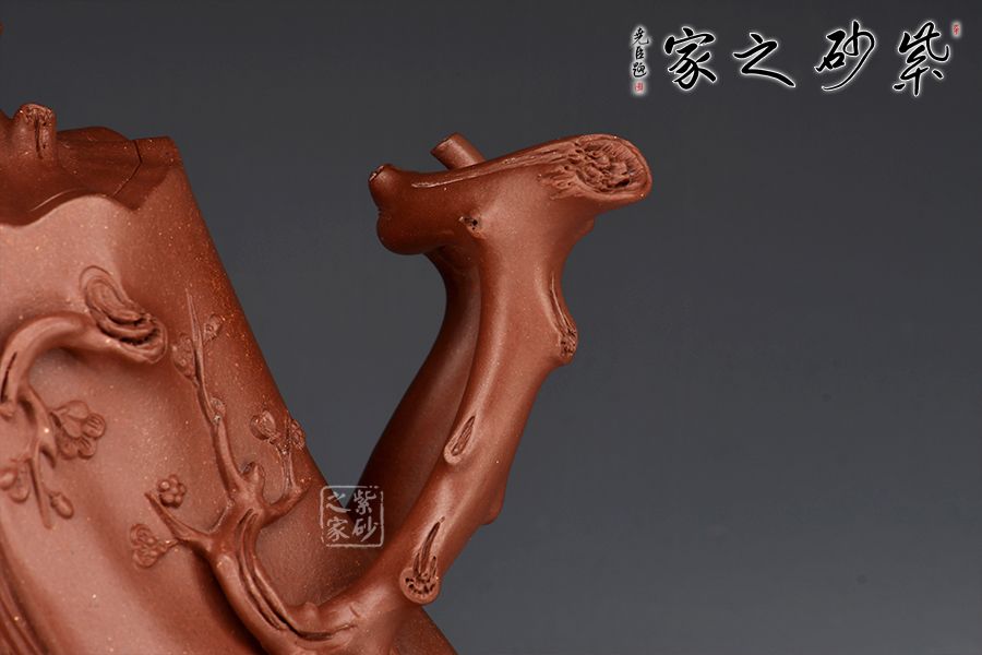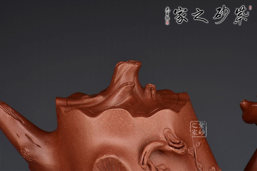 梅,歷來(lái)多次被能工巧匠們?nèi)雺?。此壺是一款?jīng)典的梅樁器型,選用原礦底槽青精制而成,以梅花燦爛綻 放表現(xiàn)報(bào)春的主題,從壺身造型到創(chuàng)作原意都洋溢著無(wú)比的朝氣,讓人感到了春天來(lái)到的勃勃生機(jī);壺身、流、把、蓋全部是用極富生態(tài)的梅樁、樹(shù)皮及纏枝組成, 形態(tài)自然而富含力度;壺上梅花采用貼花技藝手法,壺嘴壺把為梅樁衍生出的枝干,伸展自然,有如自然長(zhǎng)成,仿生性極強(qiáng),充滿(mǎn)了生命的活力。