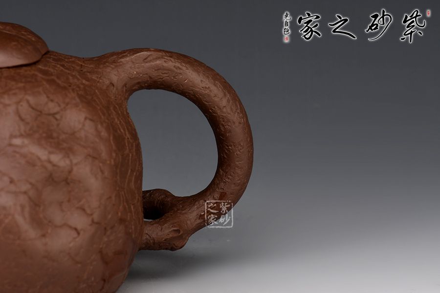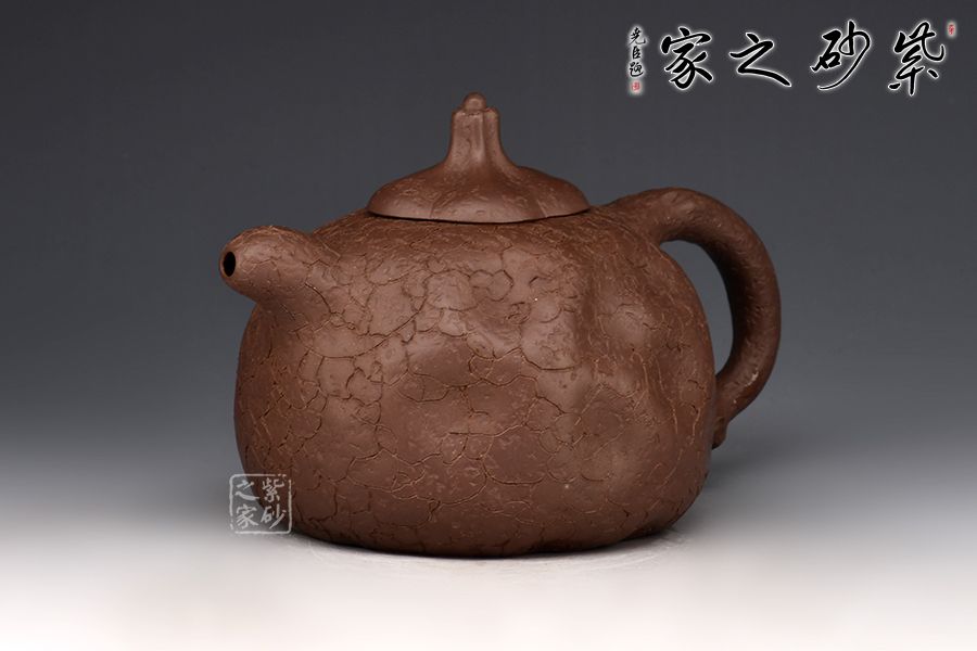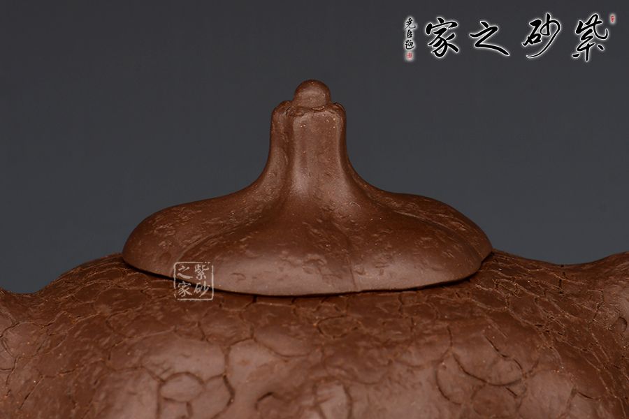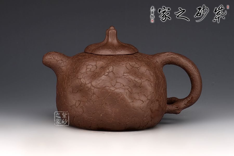 供春是中國紫砂史上不可或缺的人物,而供春壺也是紫砂史里不可或缺的一件作品。該壺與供春壺相似,只是在表面的紋飾上略有不同。供春壺以銀杏樹癭為形,以大地干裂的斑紋為裝飾。此壺體型碩大,壺身通體紋理相繞,形如嶙峋老樹,癭瘤滿布,以枝梗為把,彎流敦實。整器質(zhì)樸古拙,把握舒適,出水流暢,自然生動。壺蓋上以瓜蒂為鈕,十分別致,韻味十足。